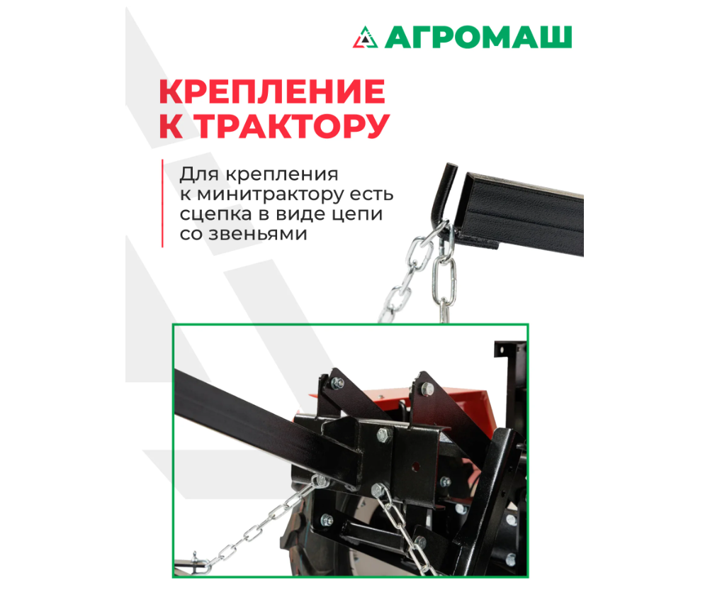 - Оснащен сцепным устройством в виде цепи со звеньями для агрегатирования с тяговым средством.