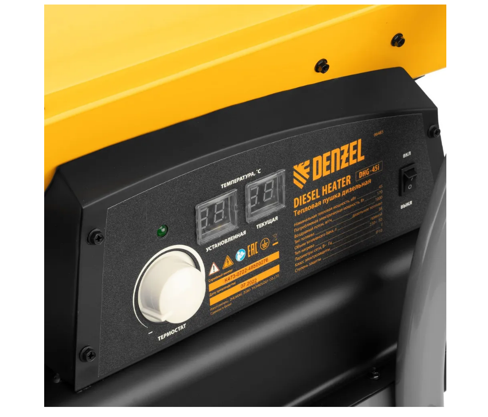 Дизельная тепловая пушка DENZEL DHG-45i, 45 кВт, 450 м2, с расходом воздуха 1000 м3/ч и прямым нагревом, цифровым термостатом и дисплеем, защитой от перегрева и трансформатором розжига