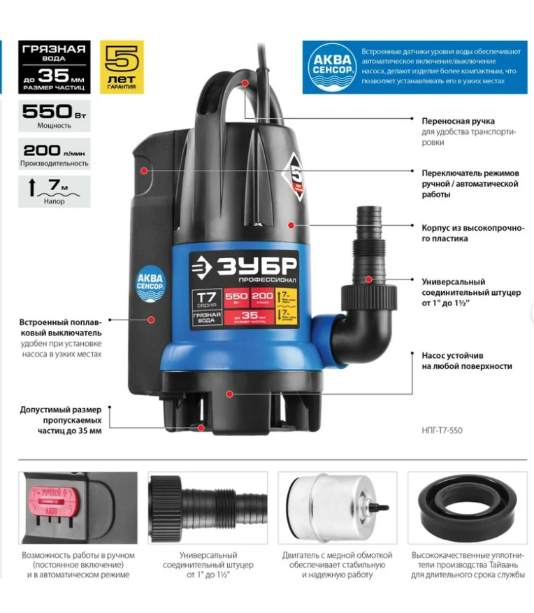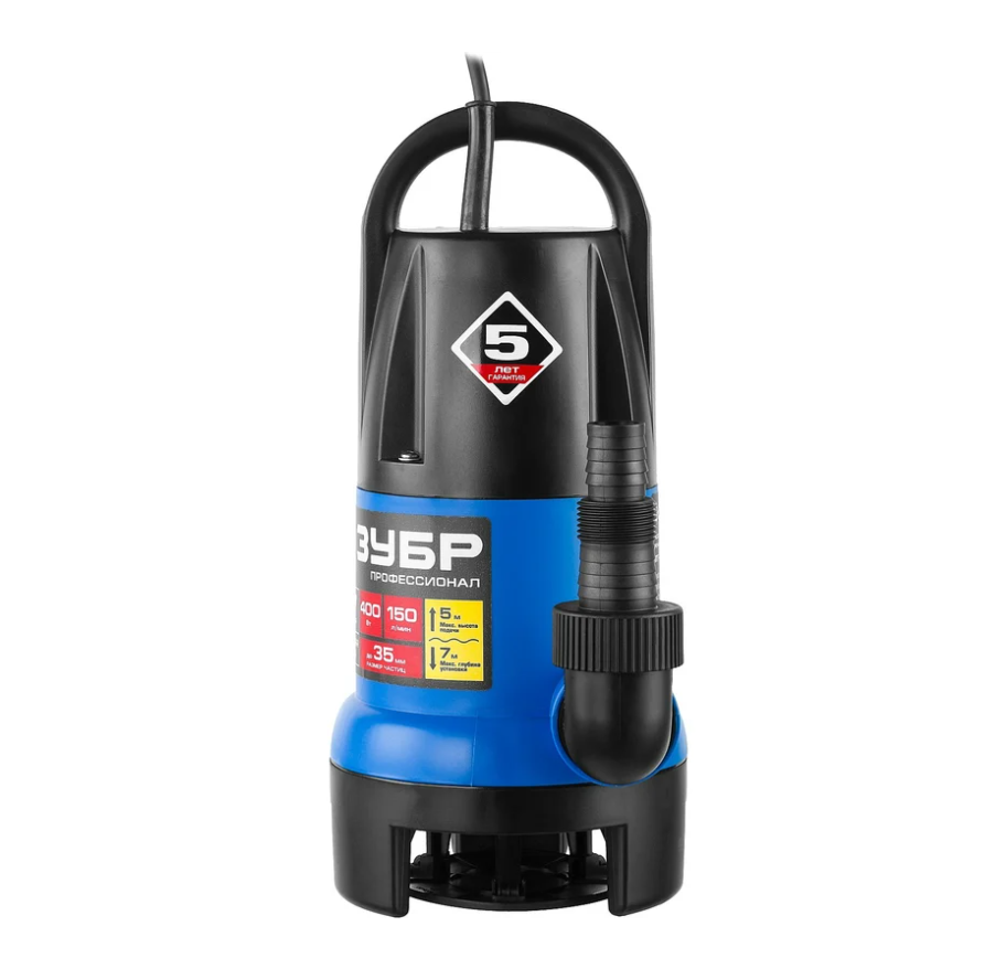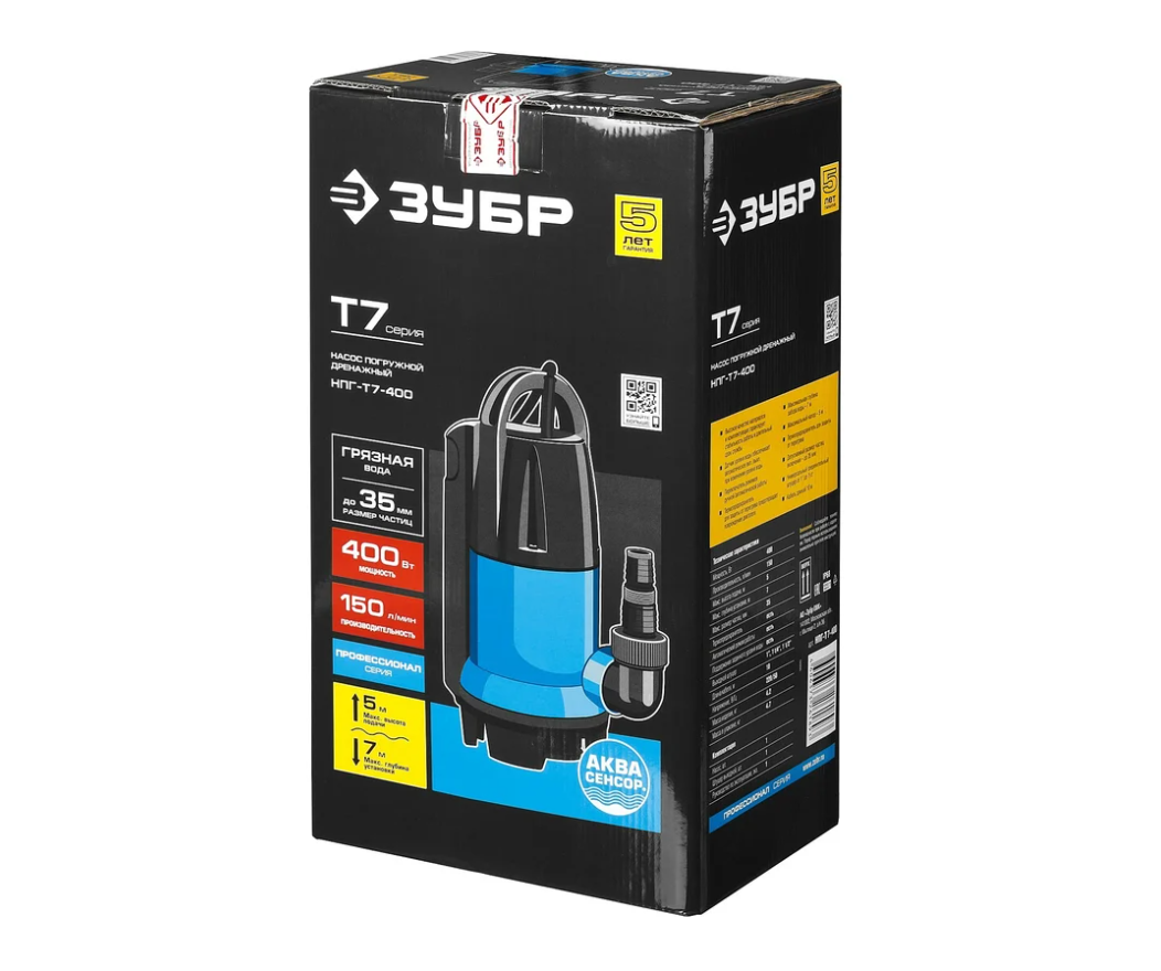 Погружной дренажный насос для грязной воды Зубр Профессионал Т7 АкваСенсор НПГ-Т7-400 - надежная модель со встроенным датчиком уровня воды. Способна перекачивать воду с мягкими фракциями размером до 35 мм. Корпус изготовлен из высокопрочного пластика. Производительность составляет 150 л/мин. Насос имеет возможность работы в ручном и в автоматическом режиме.