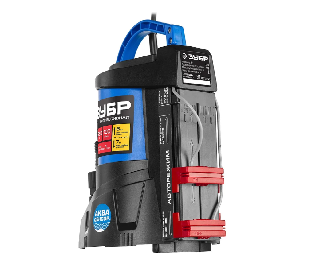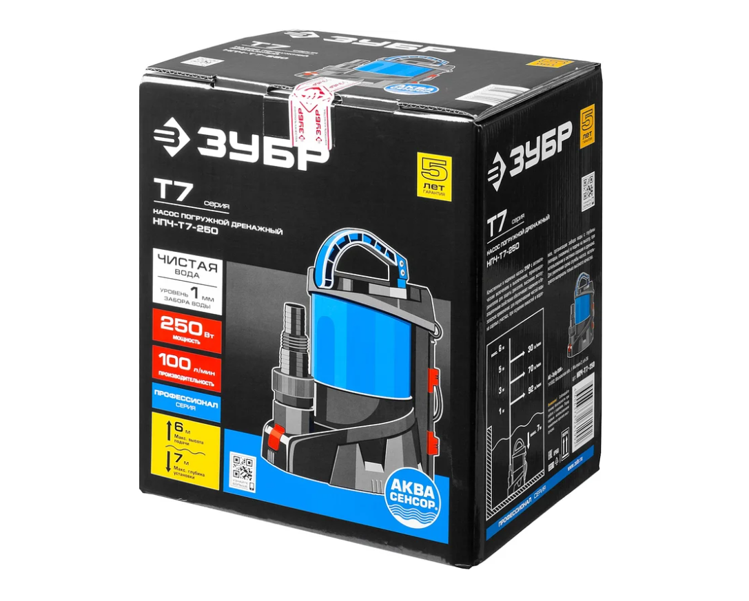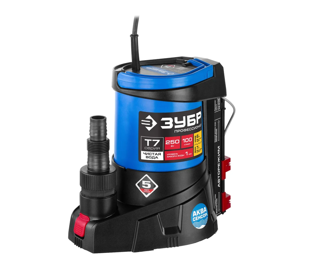 Погружной дренажный насос для чистой воды Зубр Профессионал Т7 АкваСенсор НПЧ-Т7-250 перекачивает воду из колодцев, выкачивает воду из бассейнов и резервуаров. Практически досуха собирает оставшуюся жидкость. Имеет режимы работы: ручной и автоматический.