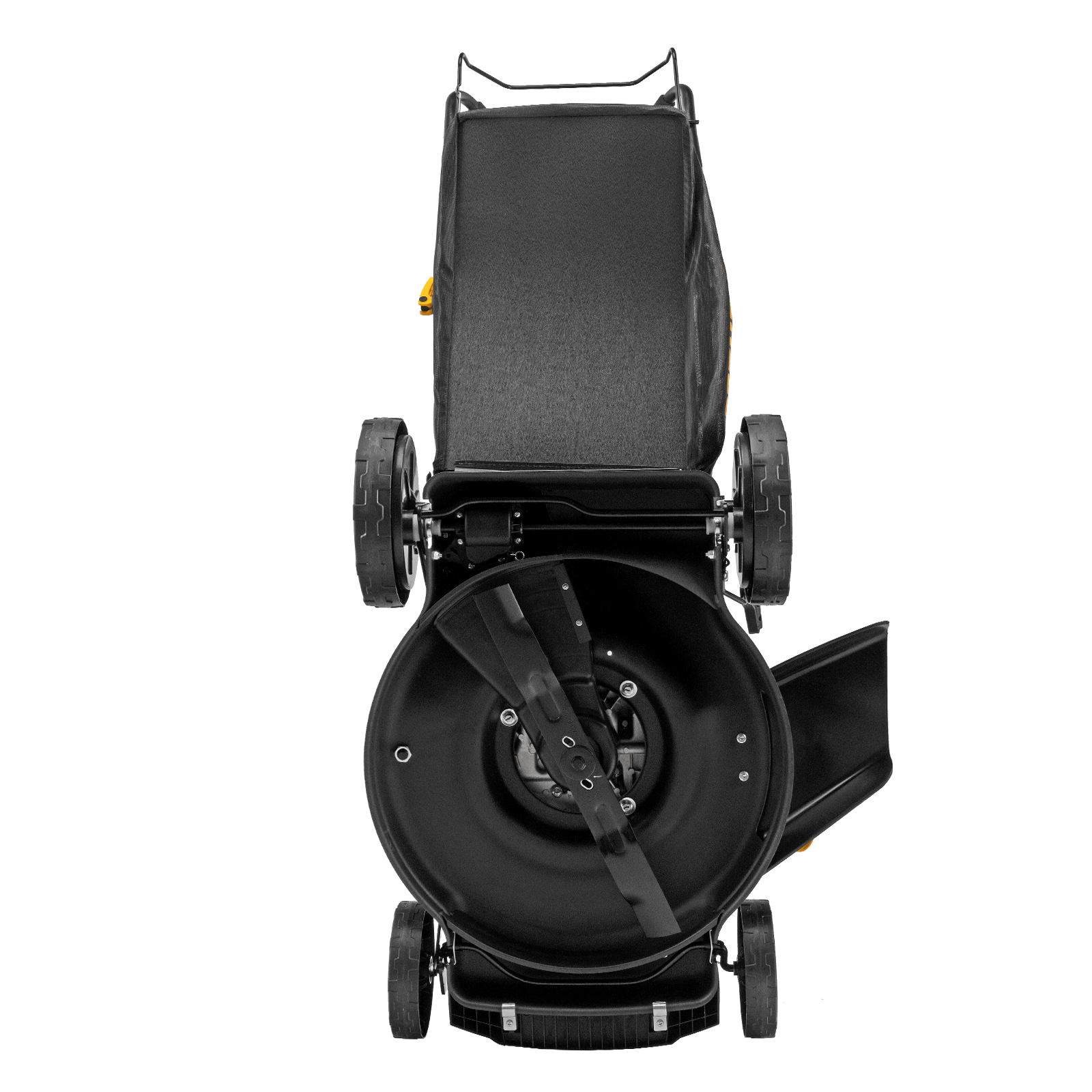 - Широкий функционал «4 в 1» — газонокосилка работает в режимах сбора травы в объемный контейнер, мульчирования, бокового выброса, а также выброса травы под деку.