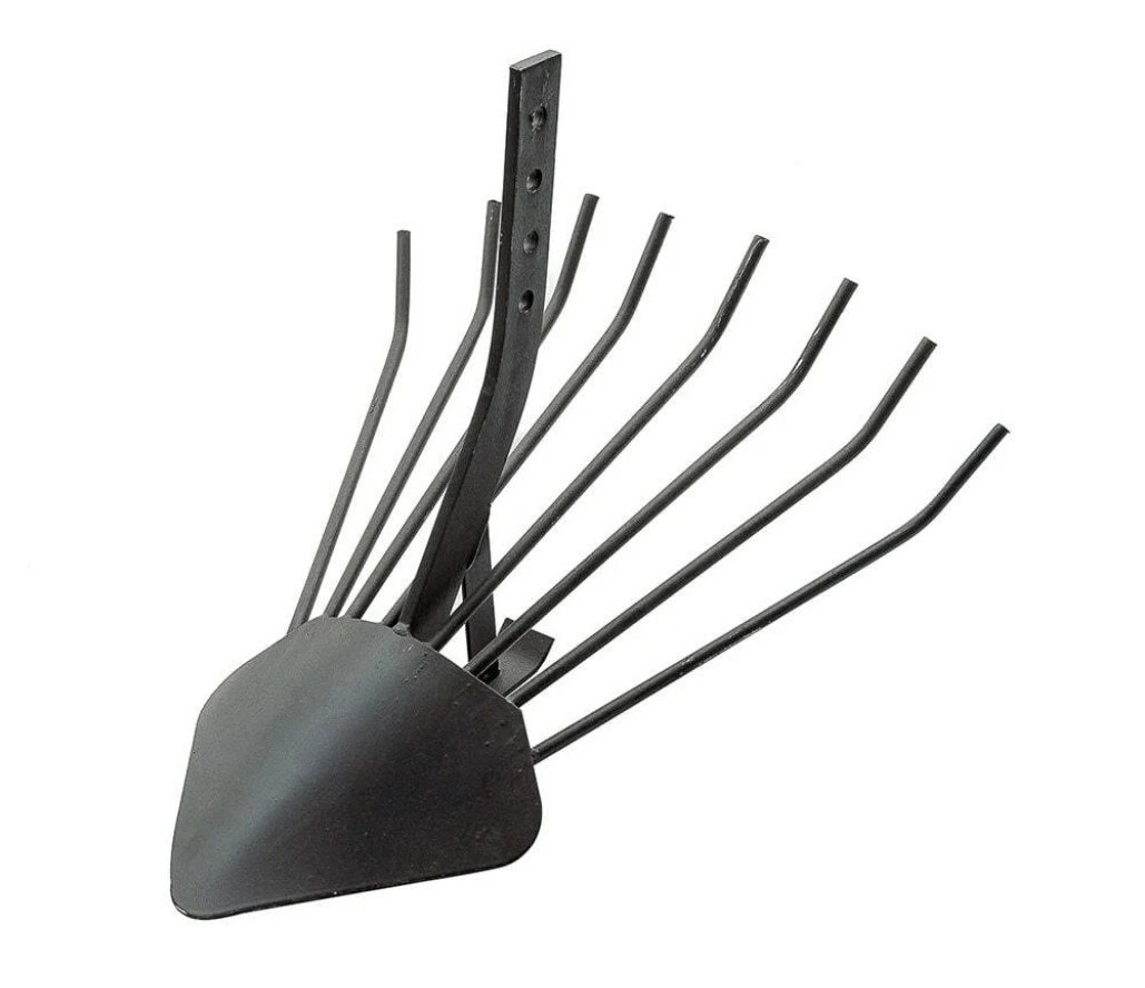 - Рабочий орган (имеющий форму лемеха с прутками или жестких зубьев) заглубляется в почву под картофельным рядком на регулируемую глубину.