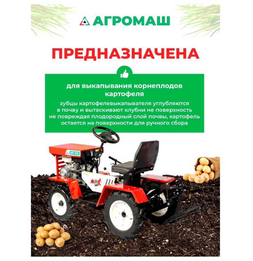 - Разработана для агрегатирования с минитрактором Агромаш МТ-110 (требуется наличие соответствующей системы навески и сцепного устройства на тракторе).