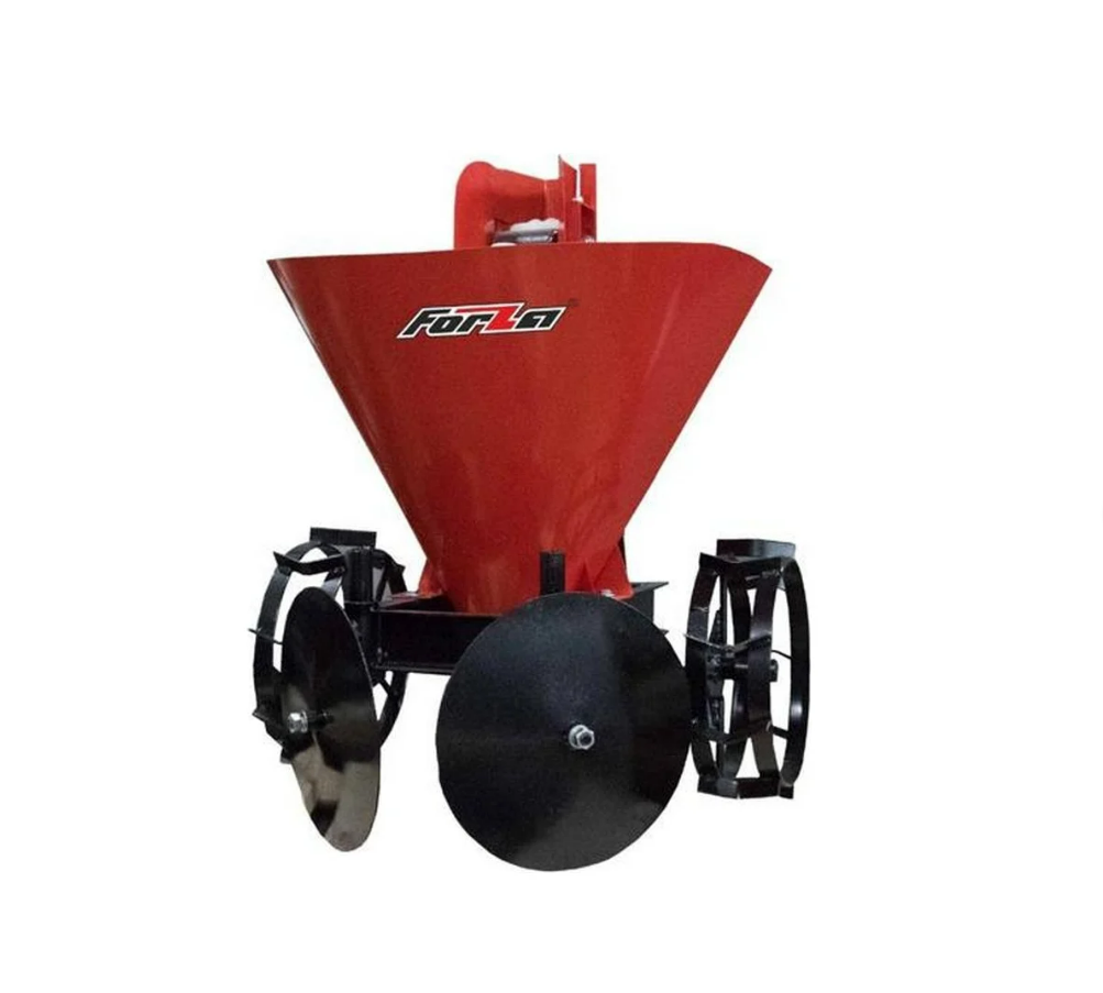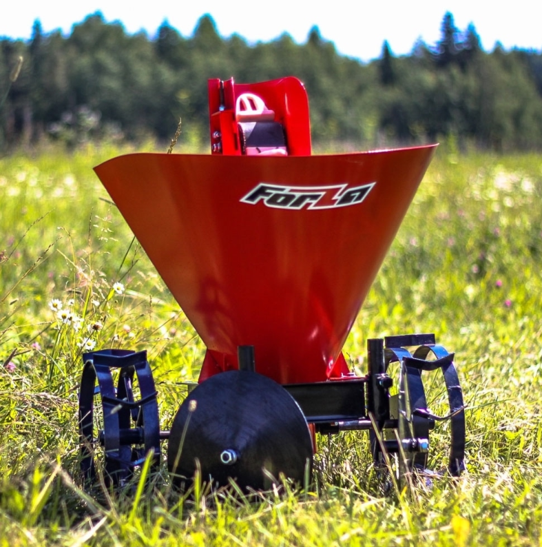 Картофелесажалка для мотоблока FORZA на грунтозацепах, с отключаемой лентой подачи клубней.