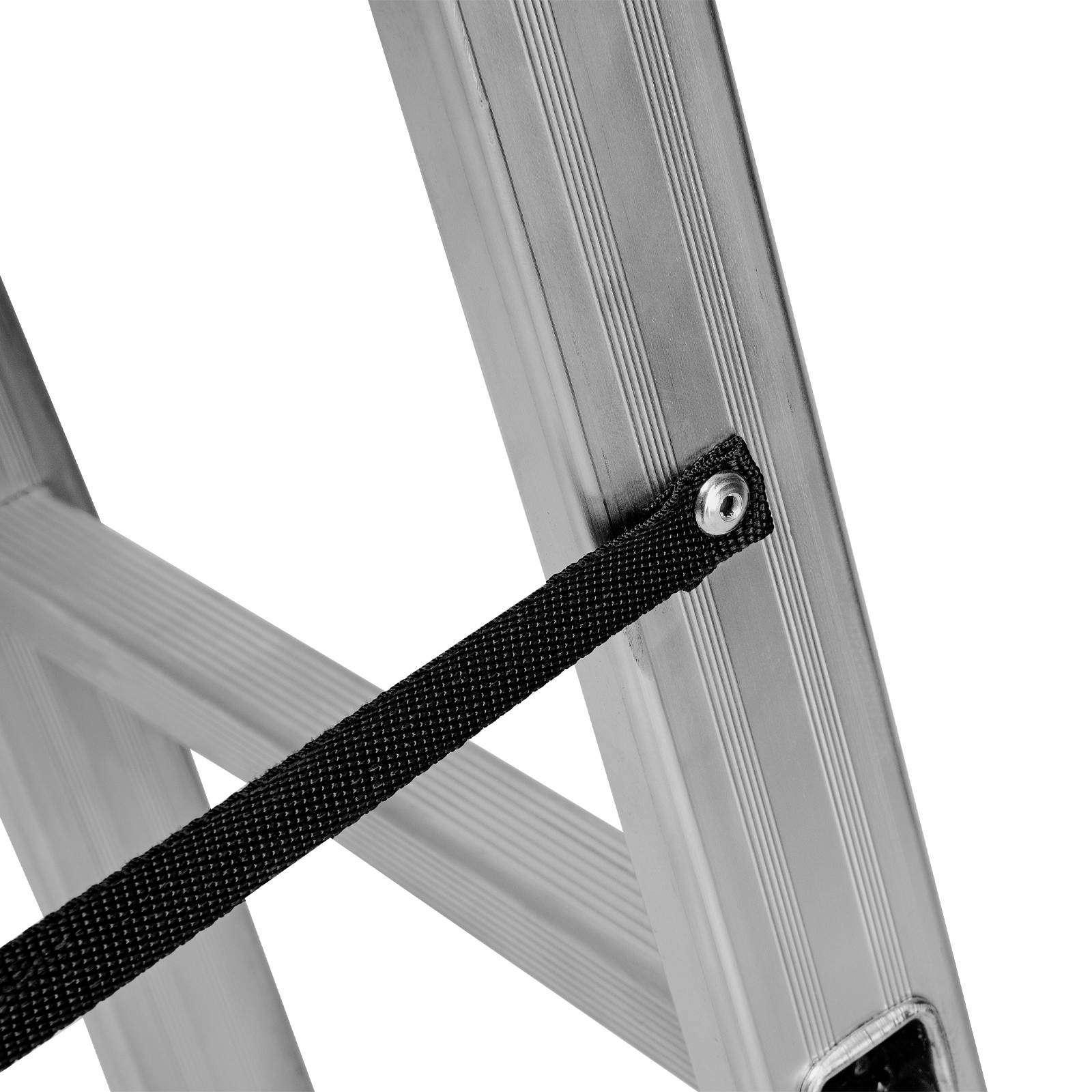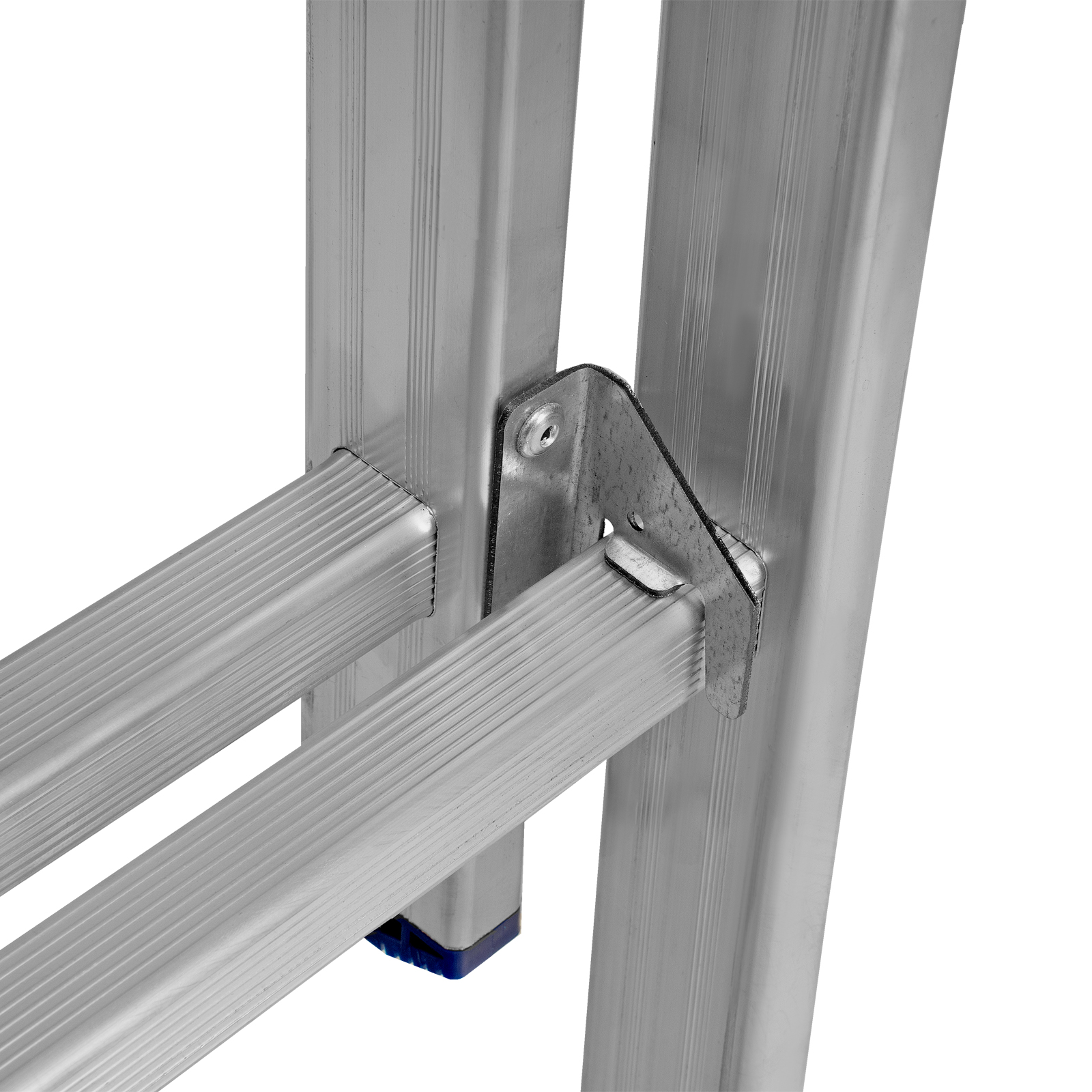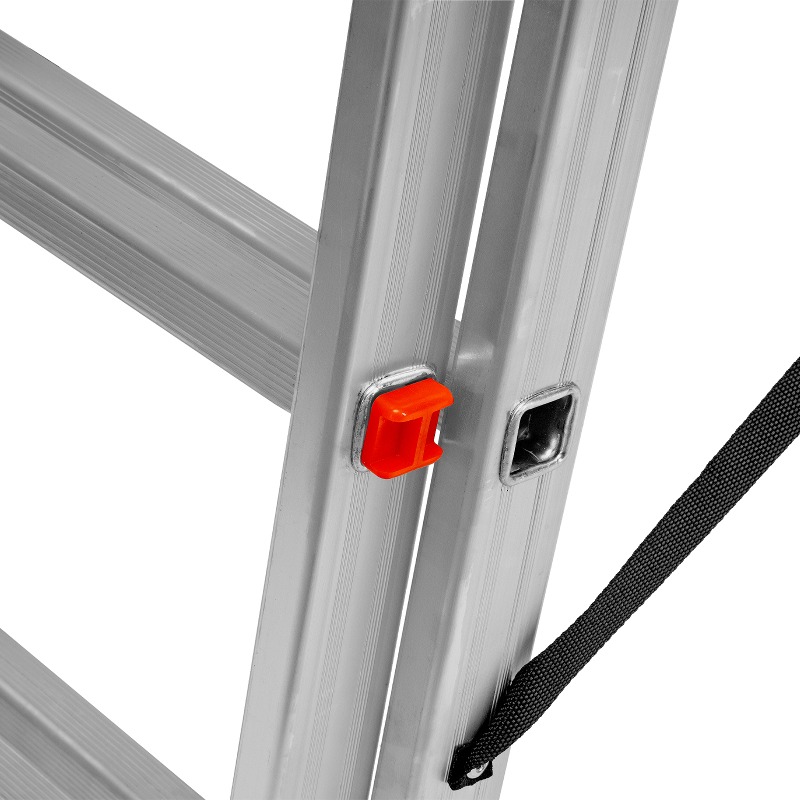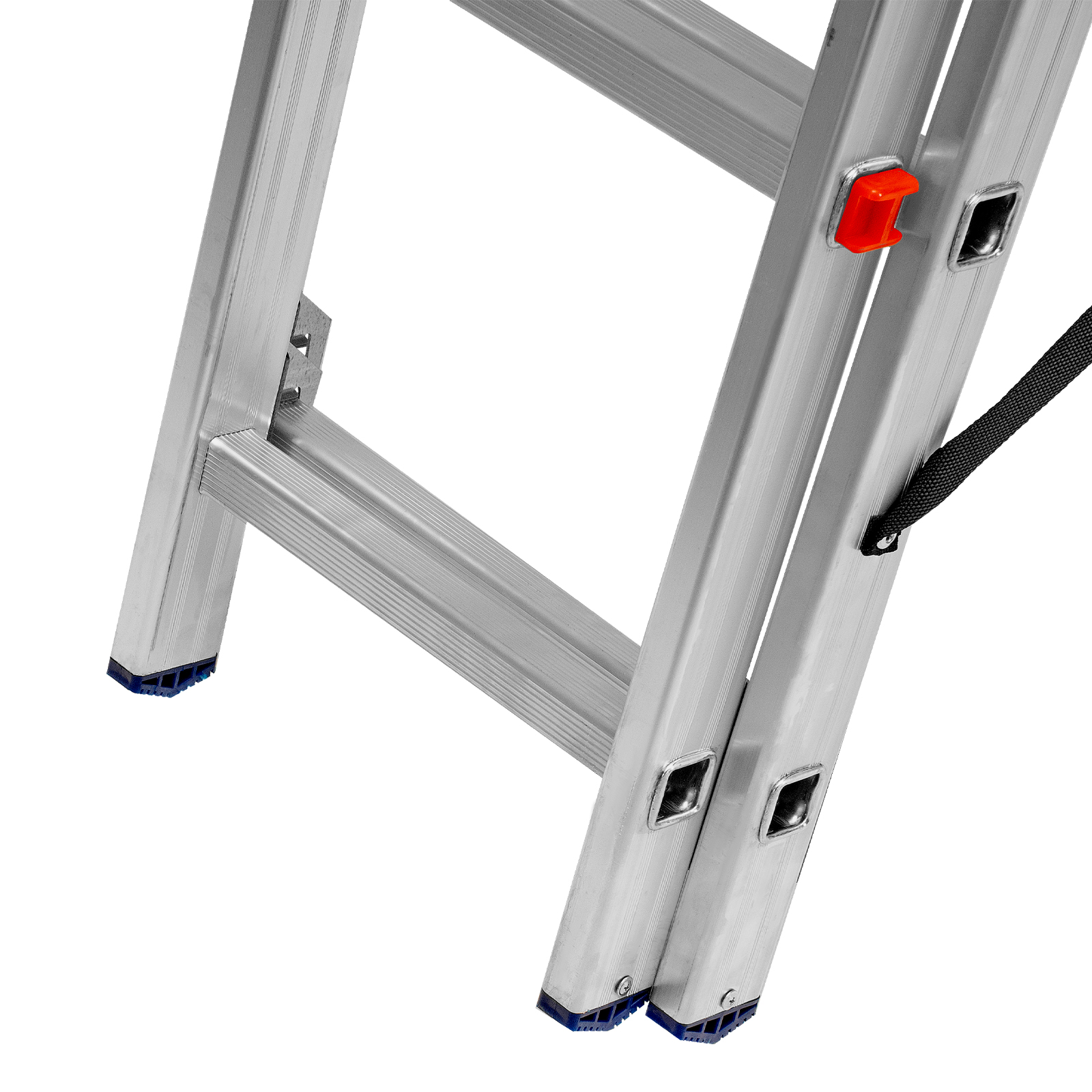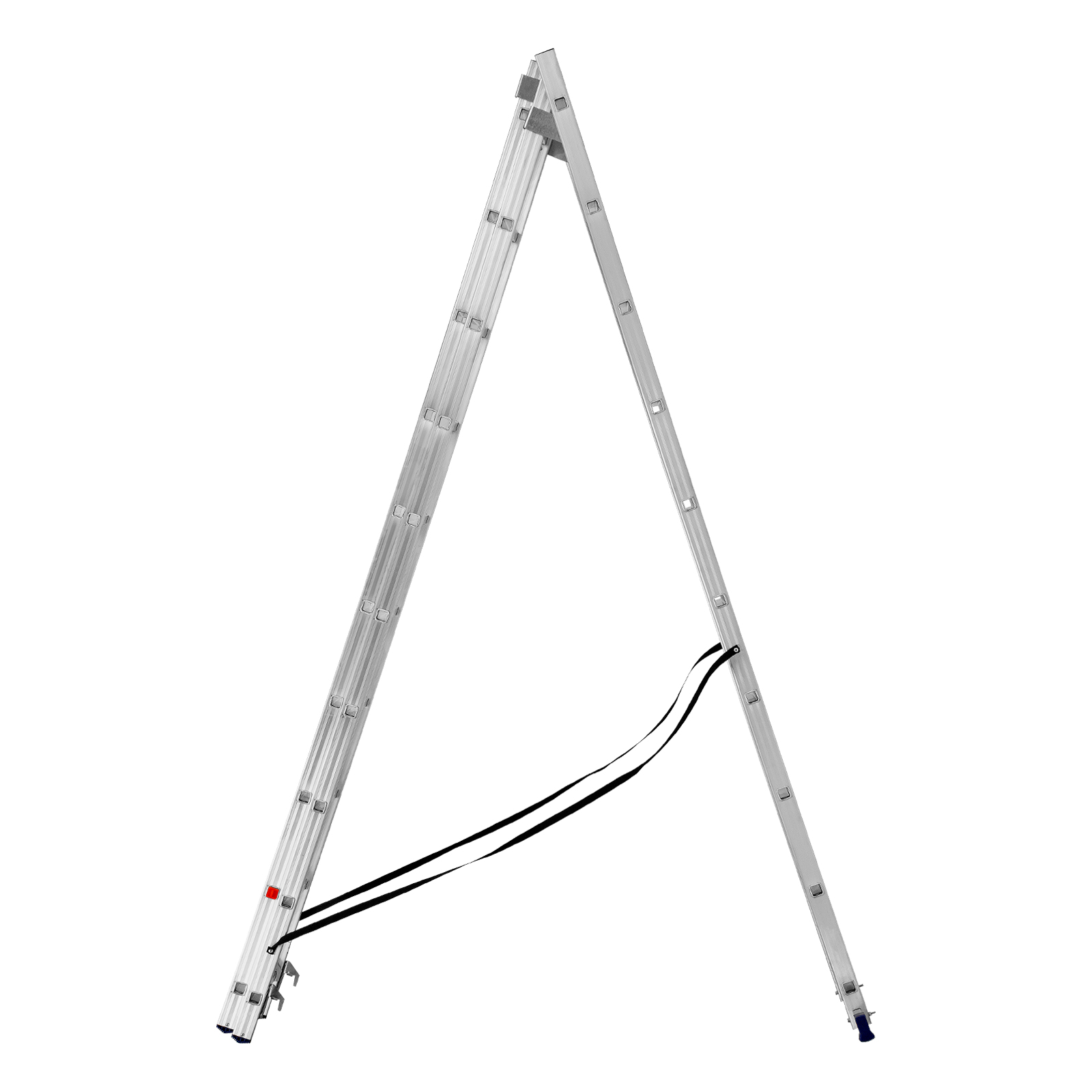 - Многофункциональность — лестница может использоваться в 3 различных вариациях — в качестве стремянки (с двумя расставленными и одной выдвинутой вверх секцией), двухсторонней стремянки (две секции расставлены, третья демонтирована) и приставной лестницы.