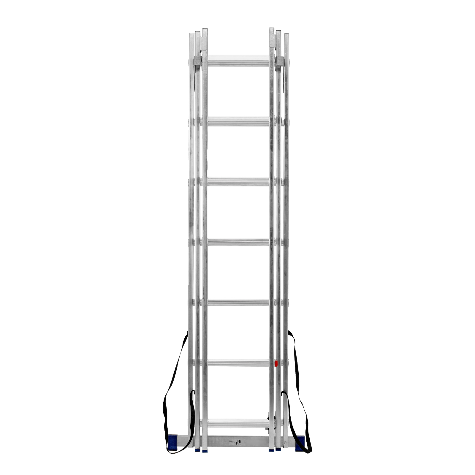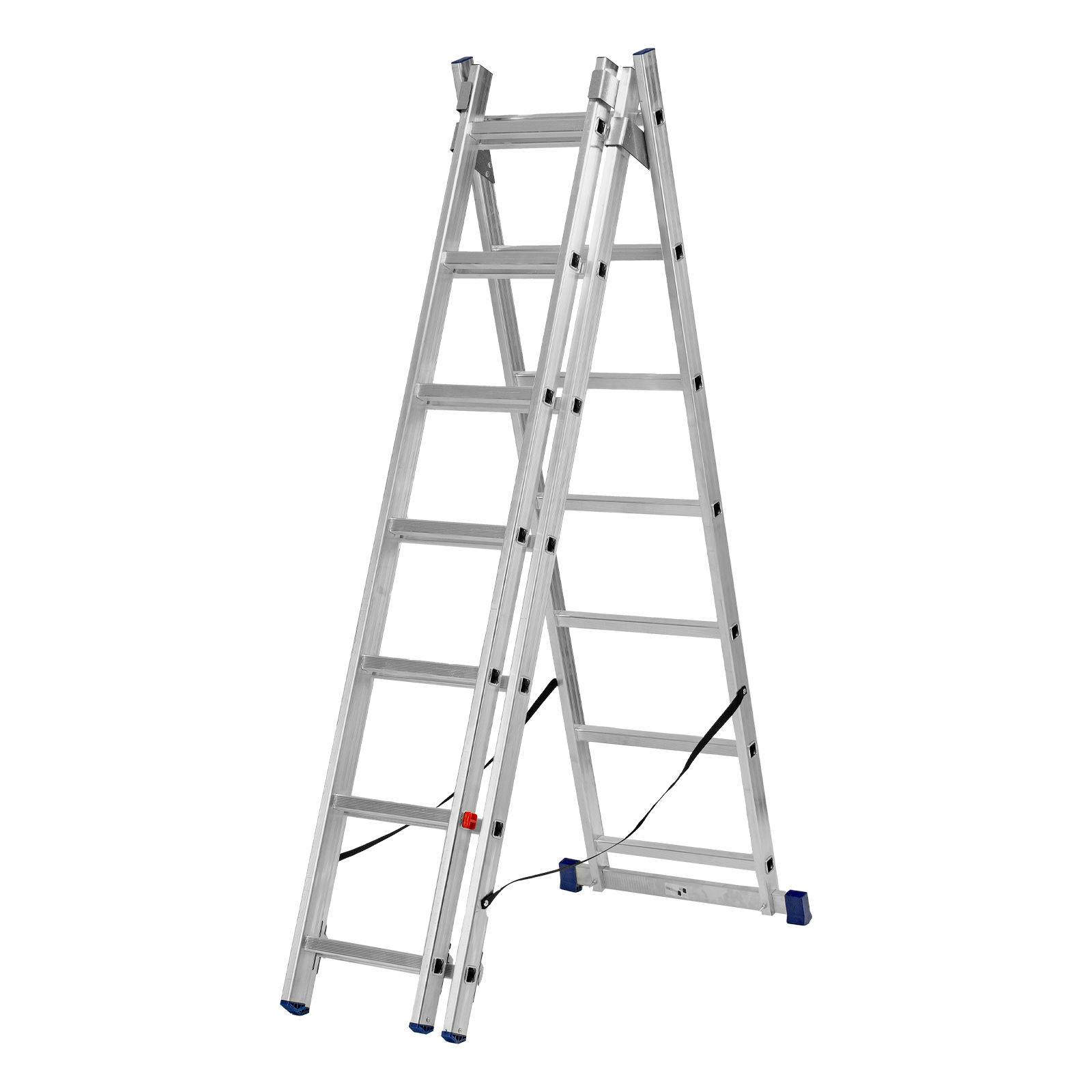 - Многофункциональность — лестница может использоваться в 3 различных вариациях — в качестве стремянки (с двумя расставленными и одной выдвинутой вверх секцией), двухсторонней стремянки (две секции расставлены, третья демонтирована) и приставной лестницы.