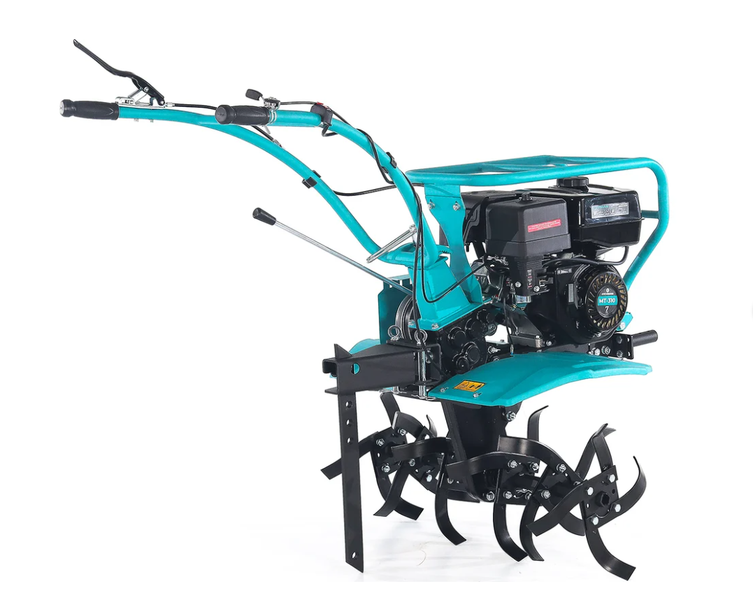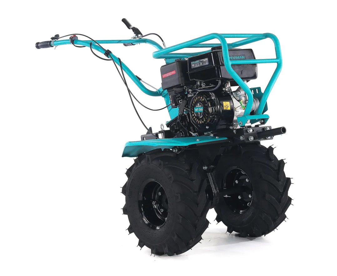 В основе мотоблока STEVIMAN МТ-310 установлен шестеренчато-цепной редуктор, обеспечивающий надежную передачу крутящего момента на рабочие органы. Ременное сцепление гарантирует плавную работу и защиту двигателя от перегрузок при встрече с препятствиями в почве. Большие пневматические колеса размером 19x7.00-8 обеспечивают превосходную проходимость и устойчивость на различных типах грунта. Вес мотоблока 71 кг создает отличное прижимное усилие, обеспечивая глубокое проникновение фрез даже в плотную почву и стабильную работу без проскальзывания колес.