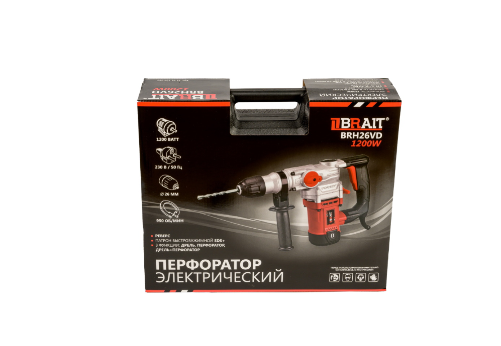 Перфоратор BRAIT BRH26VD PRO оснащен производительным двигателем мощностью 1200 Вт и способен работать в трех режимах: сверление, сверление с ударом и долбление.