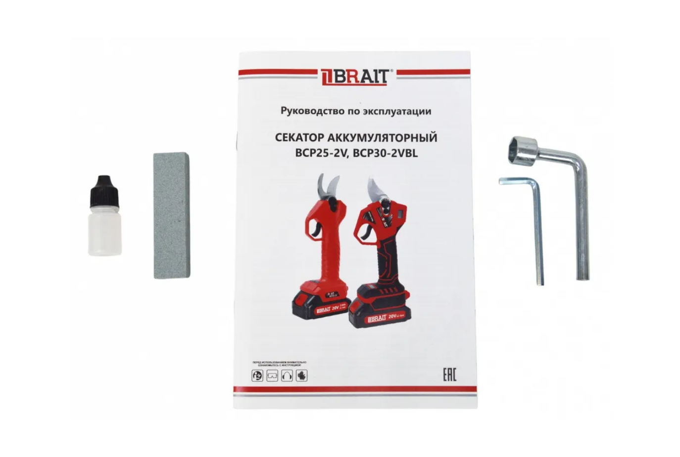 Секатор - 1шт. Аккумуляторная батарея - 2шт. Зарядное устройство - 1шт. Ключ - 1шт. Руководство по эскплутации - 1 шт.