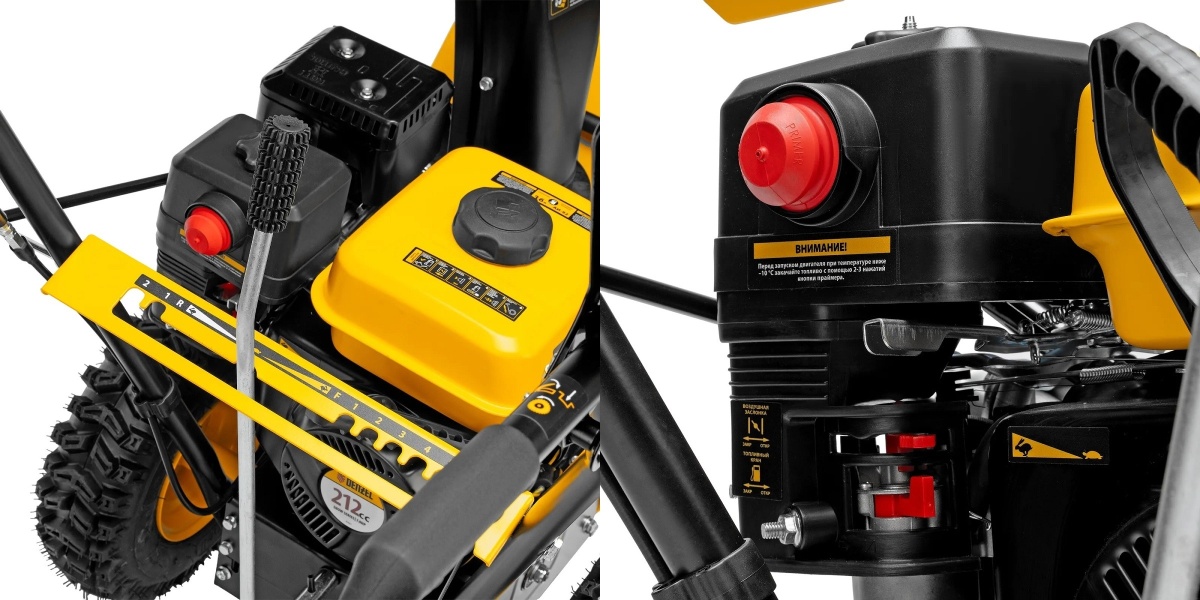 - Ручной стартер. Используется для запуска двигателя и находится в удобном и доступном месте на задней части снегоуборщика в виде рычага.