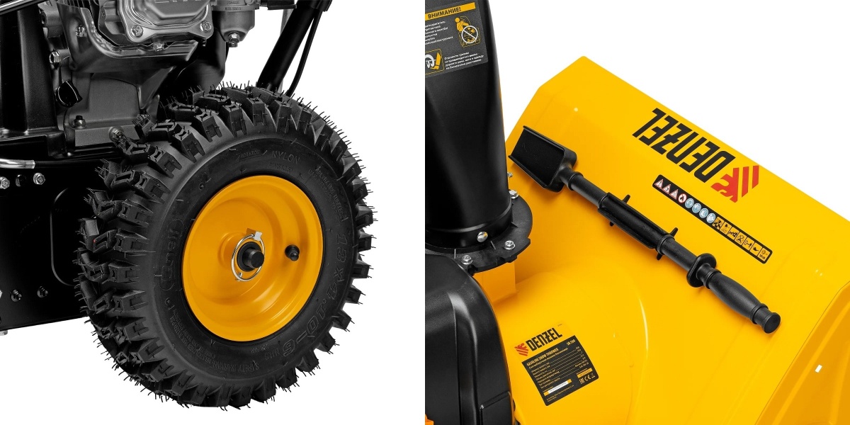 - Металлический желоб для выброса снега. Находится в удобном месте, позволяет перенаправлять выброс снега с помощью рычага.