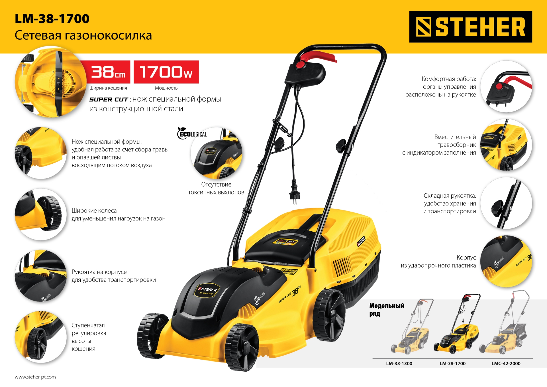 Для подстригания травы при уходе за газоном (с вращающимся ножом). Имеет функции кошения со сбором травы и регулировки высоты кошения