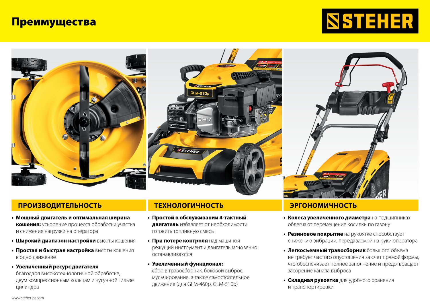 - Сбалансированные характеристики мощности двигателя и ширины кошения ускоряют процесс обработки и снижают нагрузку, чем увеличивают ресурс изделия