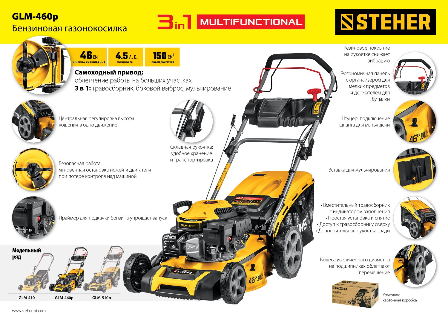 - Широкий диапазон и многоступенчатая центральная регулировка высоты кошения расширяют возможности применения газонокосилки
