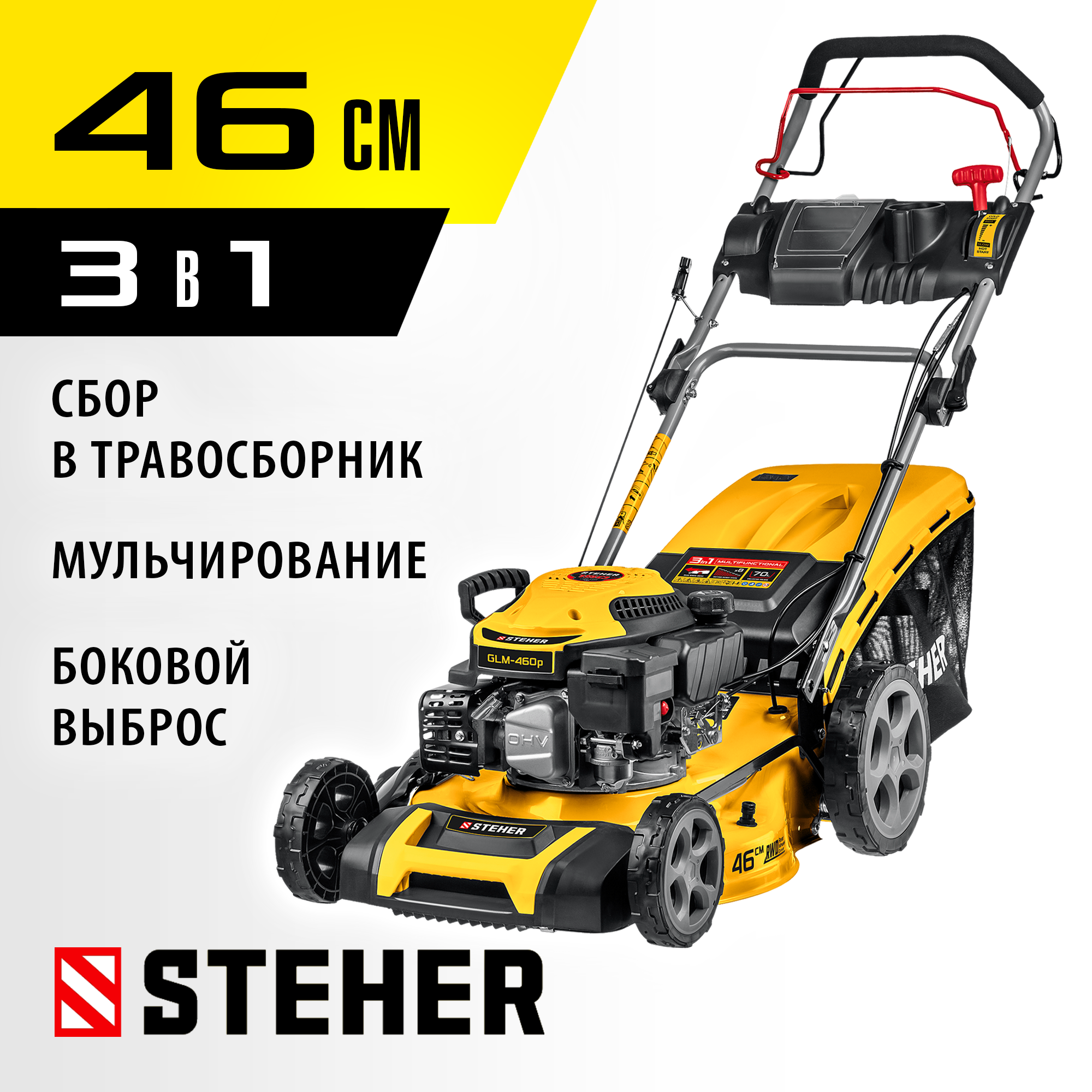 Для подстригания травы при уходе за газоном (с приводом режущего инструмента от двигателя внутреннего сгорания). Имеет функции кошения, мульчирования и выброса травы в сторону. Изделие предназначено для эксплуатации только вне помещений.