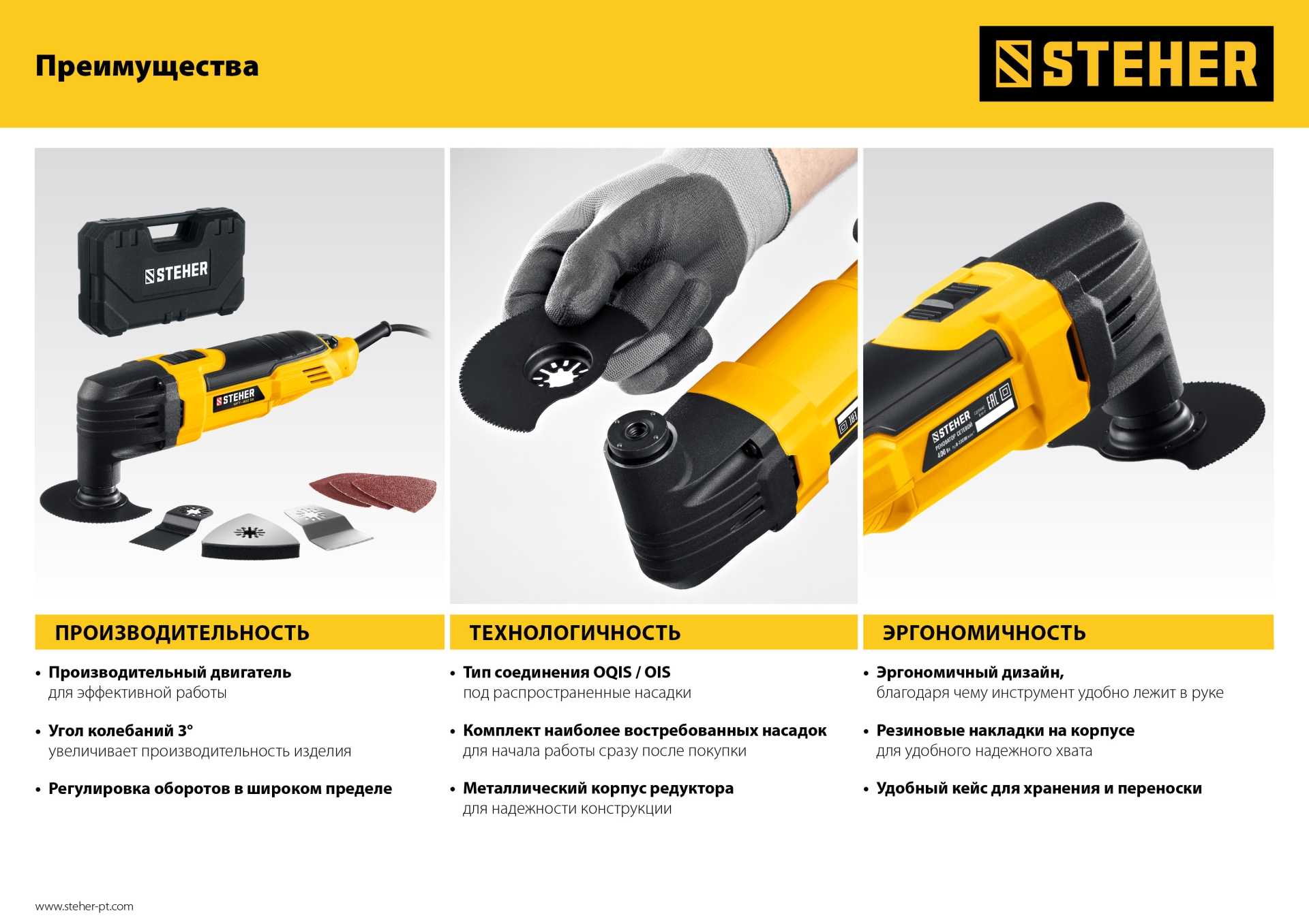Реноватор Steher - универсальное устройство для специфических работ - выпиливание внутренних отверстий, пиление в труднодоступных местах, тонкое шлифование малогабаритных деталей. Большой угол колебаний 3 градуса в сочетании с широким спектром регулировки частоты обеспечивают эффективную работу с любым материалом. Расширенная комплектация включает в себя базовый набор насадок для начала работы сразу после покупки и удобный кейс для хранения и переноски