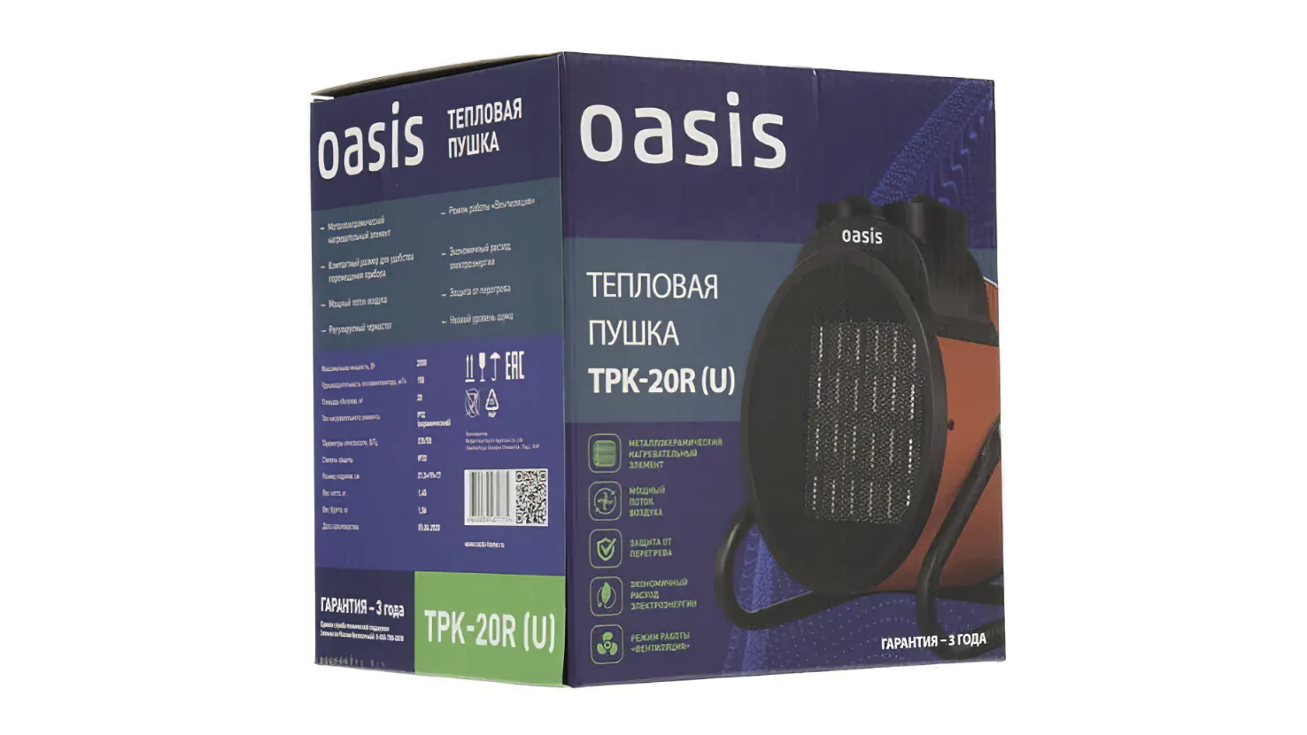 Обогреватель Oasis TPK-20R — электрическая тепловая пушка, предназначенная для обогрева помещений площадью до 20 м². Используется в качестве основного или дополнительного источника тепла для больших помещений (склады, стройплощадки, цеха и др.)
