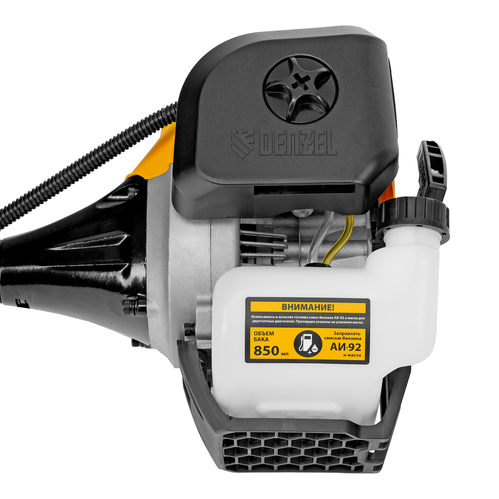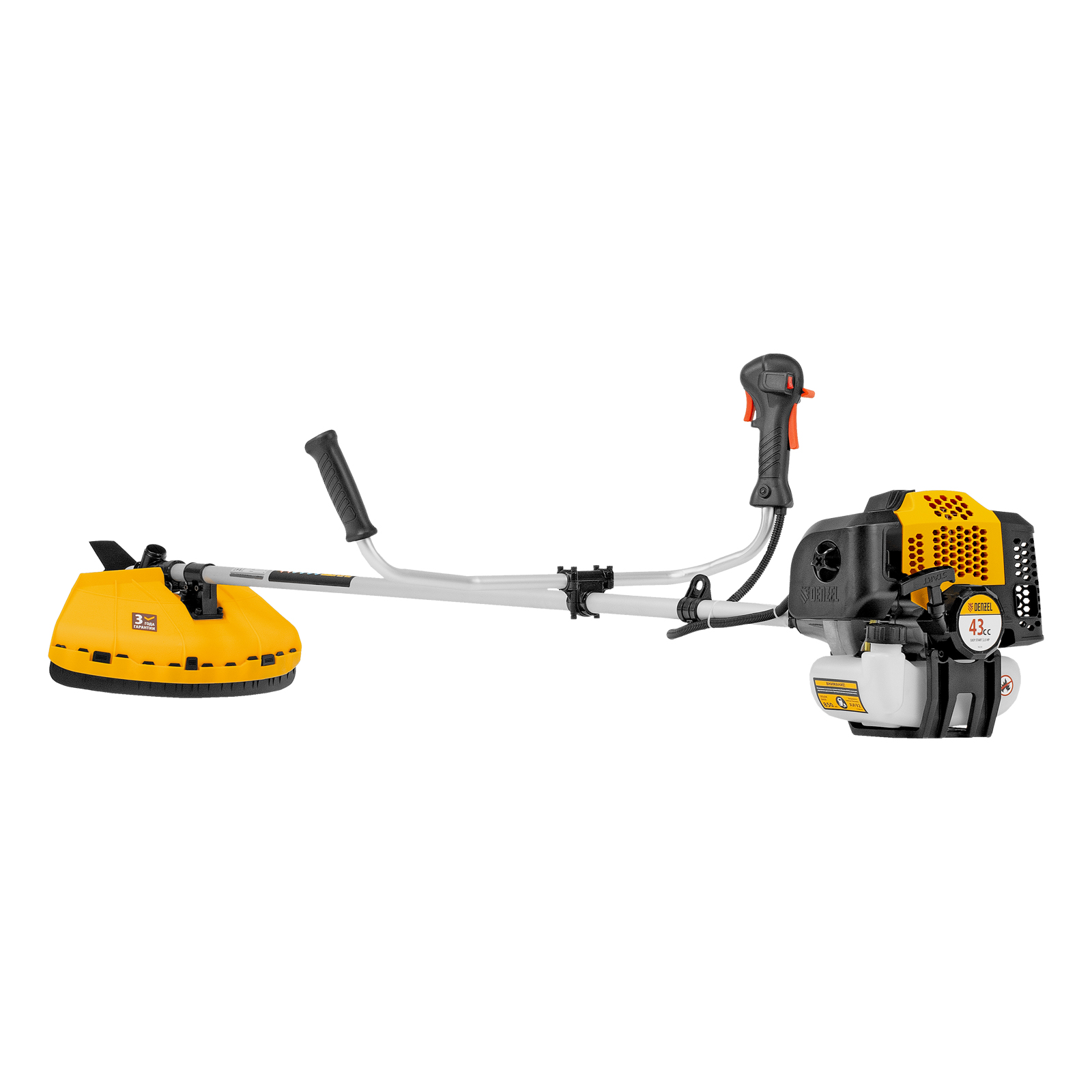 Бензиновый триммер Denzel DGT-430 с двигателем объемом 43 см3 и мощностью 2,5 л.с., с неразъемной штангой, состоит из 2 частей. Предназначен для скашивания густой травой и создания аккуратных лужаек, подходит для скашивания травы всех типов, в том числе с жесткими древовидными стеблями (полыни, крапивы, лебеды, борщевика), а также срезания кустарника и молодых побегов деревьев с диаметром стволов до 10 мм. Подходит для мест, в которых с обычными газонокосилками работать тяжело. Экономичный двигатель позволяет эффективно обрабатывать участок площадью до 9-10 соток.;В комплект поставки входят режущие насадки: усиленная полиамидная катушка, трехлопастный нож и пильный диск.