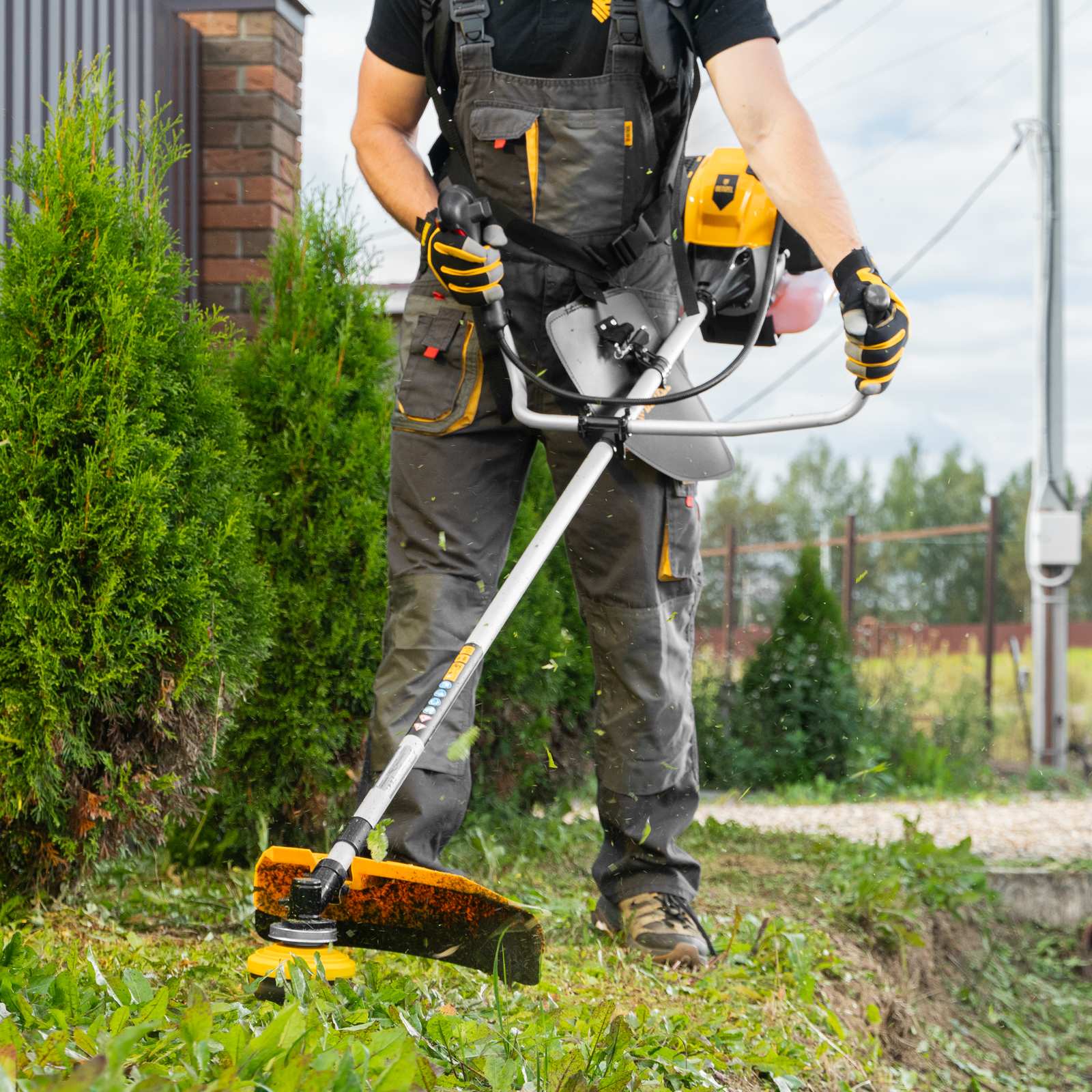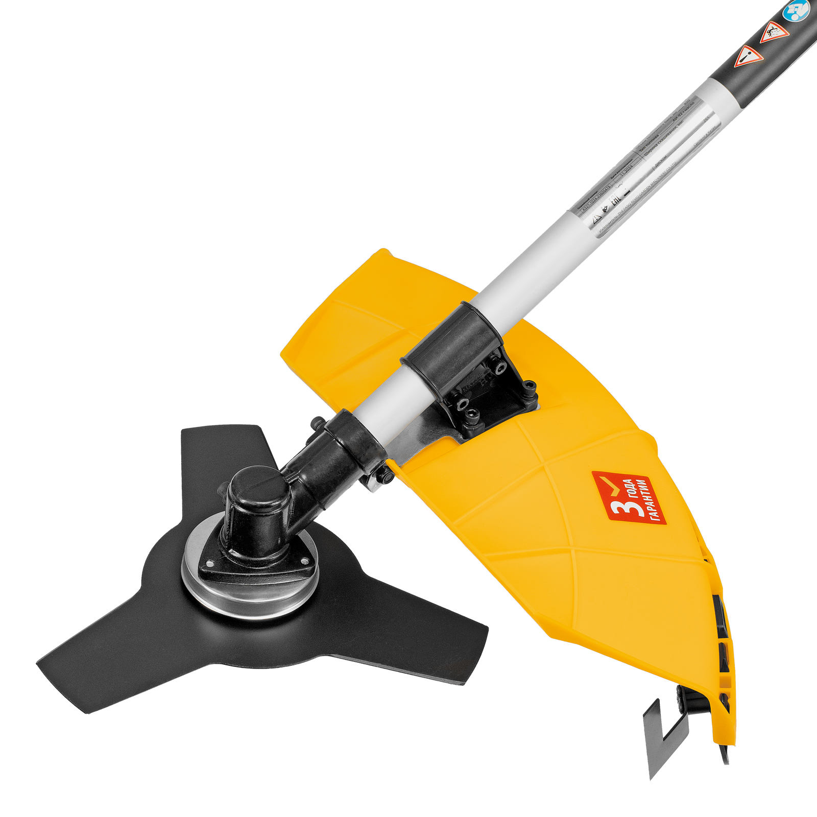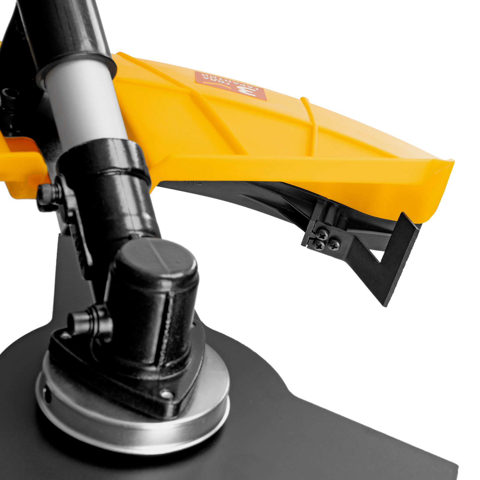 - Безопасность — пластиковый кожух защищает пользователя от вылетающих твердых частиц, травы и камней.
