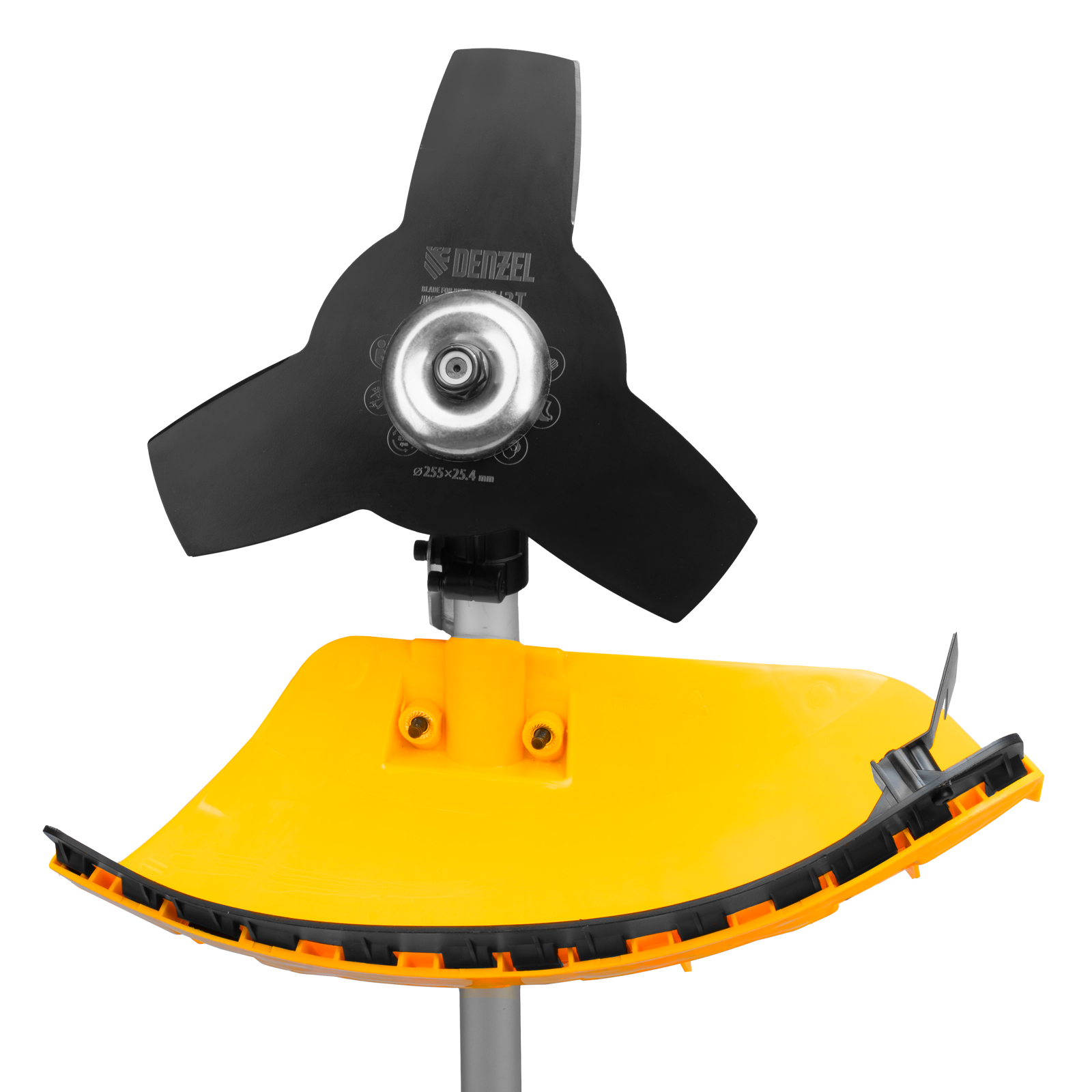 - Дополнительные возможности — можно приобрести диск Denzel 96323 с шириной скашивания 230 мм для быстрого удаления растительности с жесткими стеблями, 96328 для скашивания молодых побегов кустарника диаметром до 3 мм.