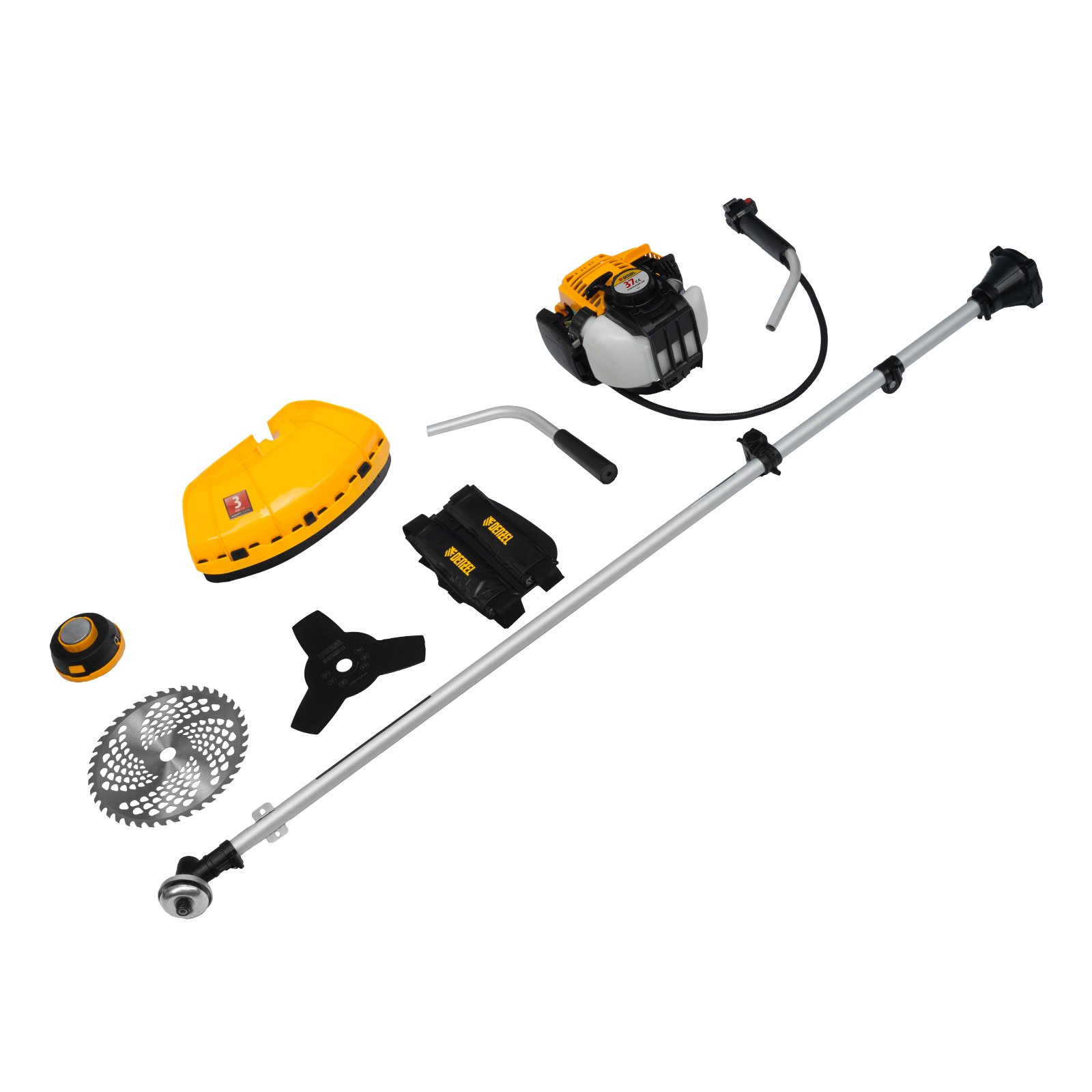 Бензиновый триммер Denzel DTL-37-4T с 4-тактным двигателем объемом 37 см3, с неразъемной штангой, состоит из 2 частей. Позволяет не только ухаживать за газоном, но и скашивать траву различных типов, в том числе с жесткими стеблями (полынь, крапиву, лебеду), а также срезать борщевик, кустарник и молодые побеги деревьев с ветвями диаметром до 10 мм. В комплекте поставки сразу 3 оснастки: леска с шириной скашивания 42 см, трехлопастный нож с шириной скашивания 25,5 см и пильный диск. Четырехтактный двигатель мощностью 1,4 л. с. позволяет выполнять большой объем работ без риска перегрева. Он потребляет топливо экономичнее двухтактных аналогов и меньше подвержен износу.