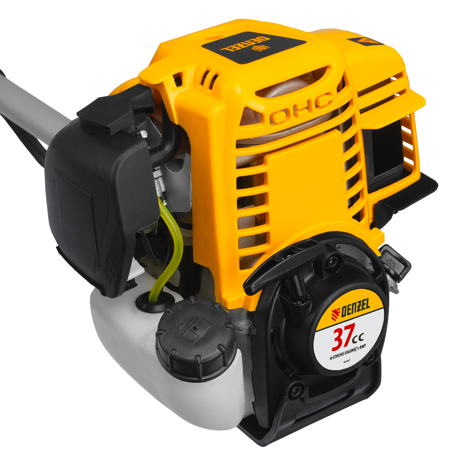Бензиновый триммер Denzel DTL-37-4T с 4-тактным двигателем объемом 37 см3, с неразъемной штангой, состоит из 2 частей. Позволяет не только ухаживать за газоном, но и скашивать траву различных типов, в том числе с жесткими стеблями (полынь, крапиву, лебеду), а также срезать борщевик, кустарник и молодые побеги деревьев с ветвями диаметром до 10 мм. В комплекте поставки сразу 3 оснастки: леска с шириной скашивания 42 см, трехлопастный нож с шириной скашивания 25,5 см и пильный диск. Четырехтактный двигатель мощностью 1,4 л. с. позволяет выполнять большой объем работ без риска перегрева. Он потребляет топливо экономичнее двухтактных аналогов и меньше подвержен износу.