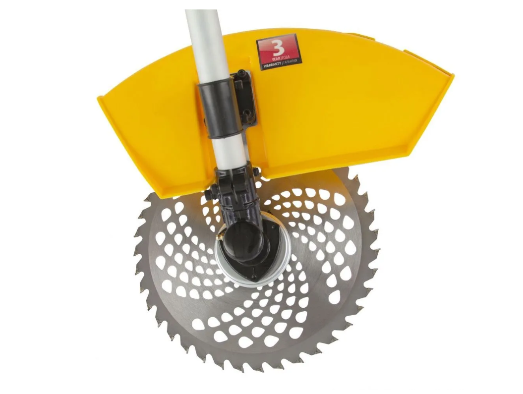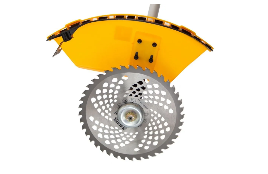 Дополнительные возможности — можно приобрести и установить на триммер диски Denzel 96323, 96325 для быстрого удаления растительности с жесткими стеблями (полыни, крапивы, лебеды), 96328 для скашивания молодых побегов кустарника диаметром до 3 мм.