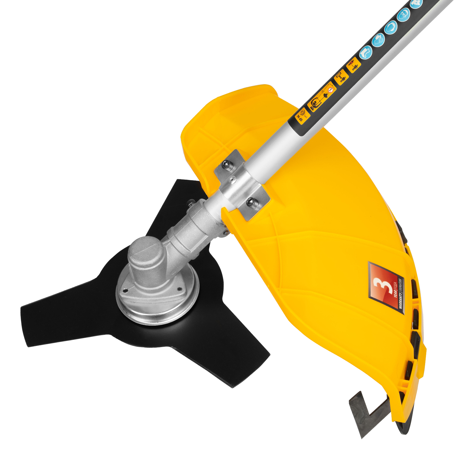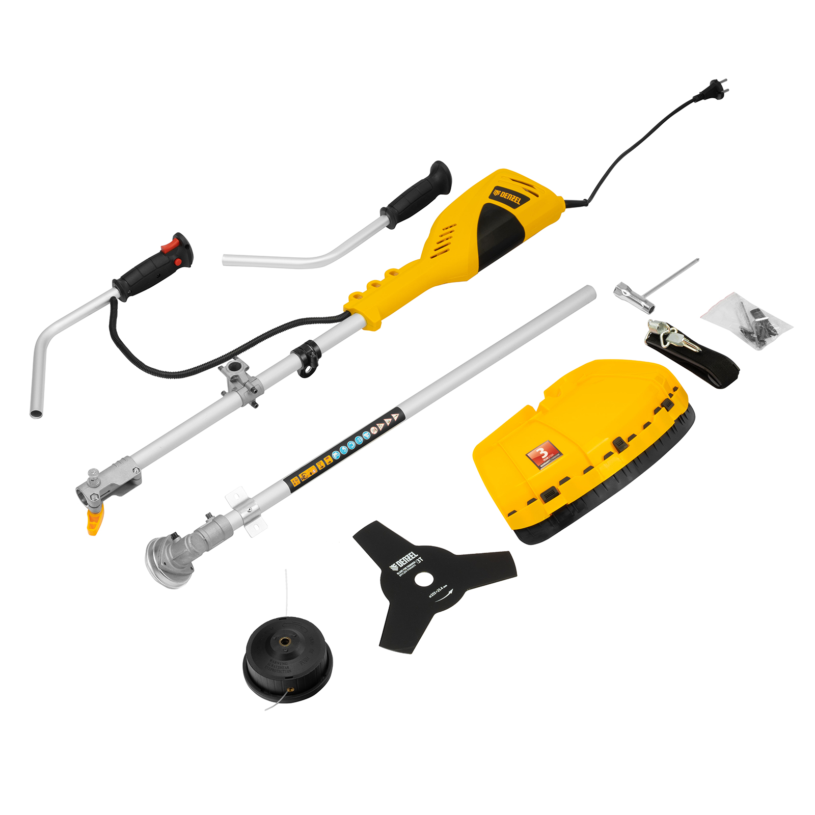 Триммер Denzel TE-1400 мощностью 1400 Вт, с разборной штангой, комплектуется катушкой с леской и 3-лопастным диском, ширина скашивания составляет 420 мм и 255 мм соответственно. Идеален для скашивания травы различных типов, в том числе с жесткими стеблями (полыни, крапивы, лебеды). Благодаря верхнему расположению двигателя может косить мокрую траву. Двигатель мощностью 1400 Вт обеспечивает вращение оснастки с частотой 7500 об/мин, поэтому уход за участком не займет много времени. Электротриммер прост в обращении — ему не требуется сложное техническое обслуживание, пользоваться им сможет даже новичок. ;К триммеру можно приобрести диск Denzel 96323 с шириной скашивания 230 мм для быстрого удаления растительности с жесткими стеблями, 96328 для скашивания молодых побегов кустарника диаметром до 3 мм, 96340 для срезания борщевика, кустарника и молодых побегов деревьев с диаметром стволов до 10 мм.