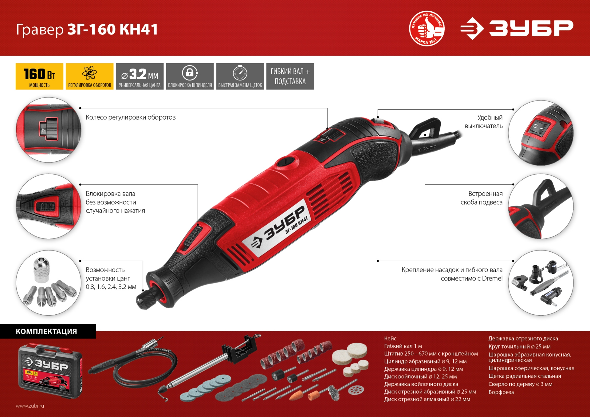 Гравер ЗУБР - универсальное устройство для широкого спектра работ (резка, сверление, полирование, гравирование, шлифование). Расширенная комплектация включает в себя базовый набор насадок для начала работы сразу после покупки. Мощный двигатель позволяет эффективно работать даже при большой нагрузке. ЗУБР - реализуя Ваши мечты