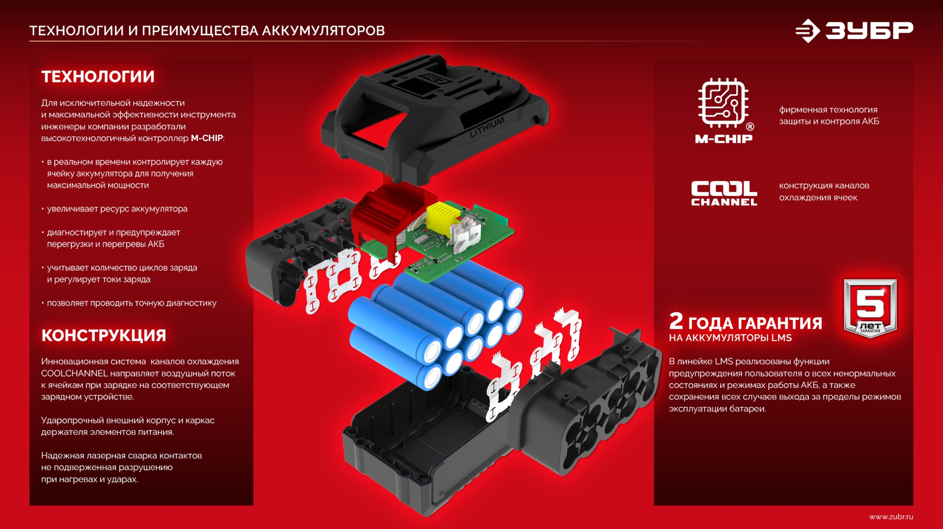 - Система М-CHIP через специальный разъем постоянно контролирует состояние каждой ячейки аккумулятора при эксплуатации, зарядке и хранении для гарантированной защиты от: