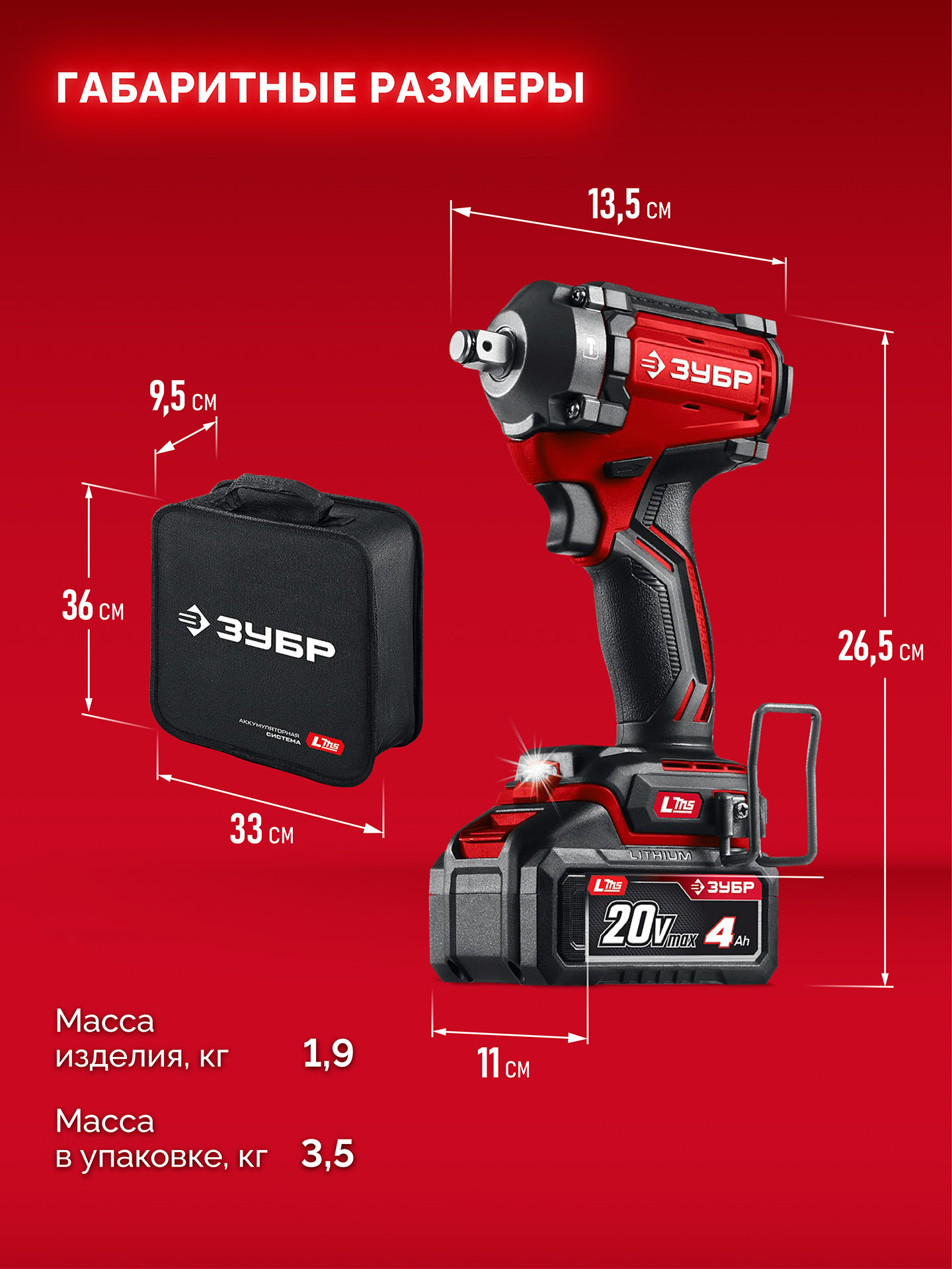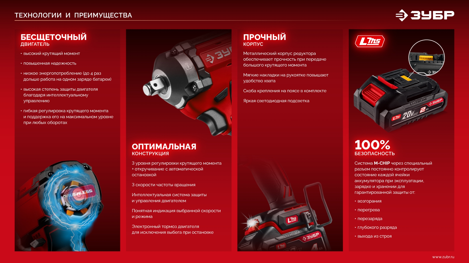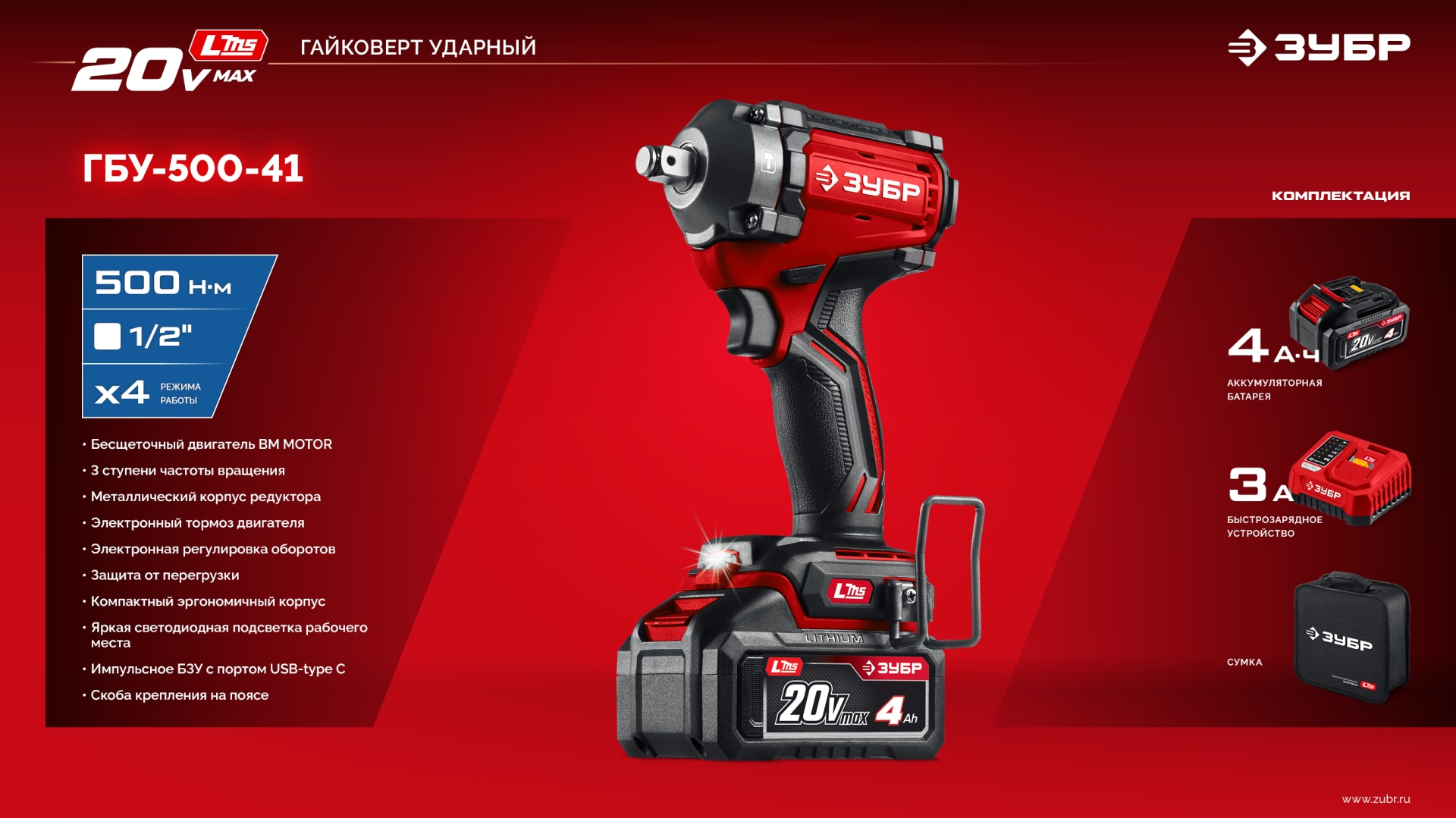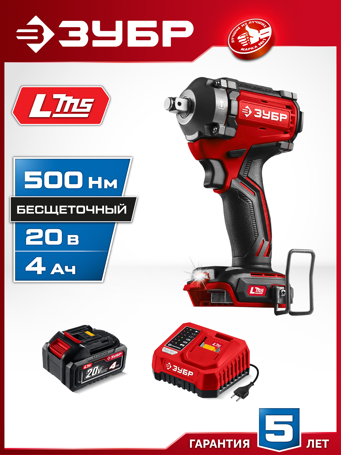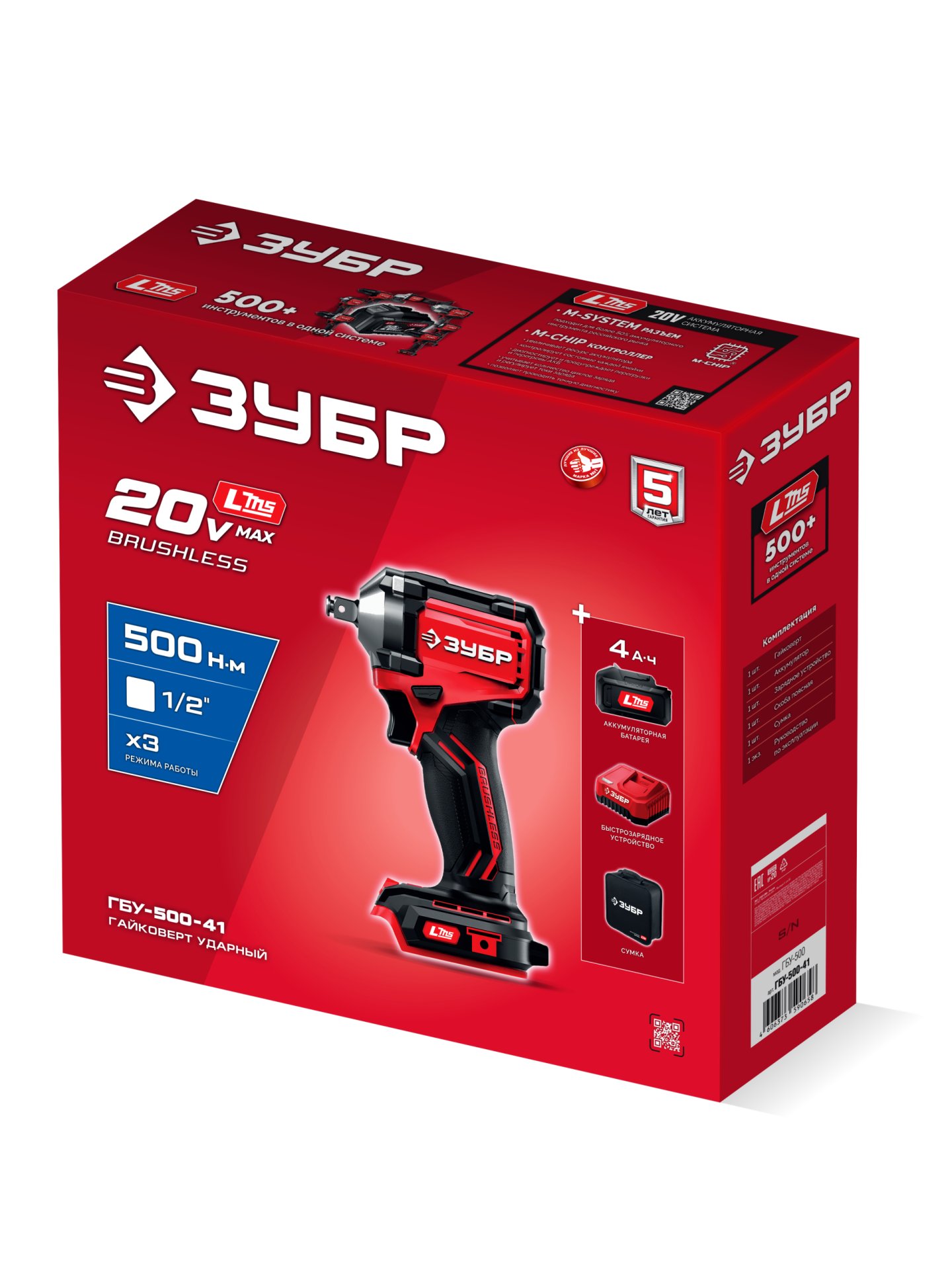 Бесщеточный ударный гайковерт ЗУБР системы LMS с максимальным крутящим моментом 500 Нм предназначен для фиксации резьбовых соединений размером до М22. Ударная функция с тангенциальным направлением удара обеспечивает эффективное заворачивание без реактивного момента на кисть оператора. Комплектация с аккумулятором большой емкости позволяет работать дольше на одном заряде