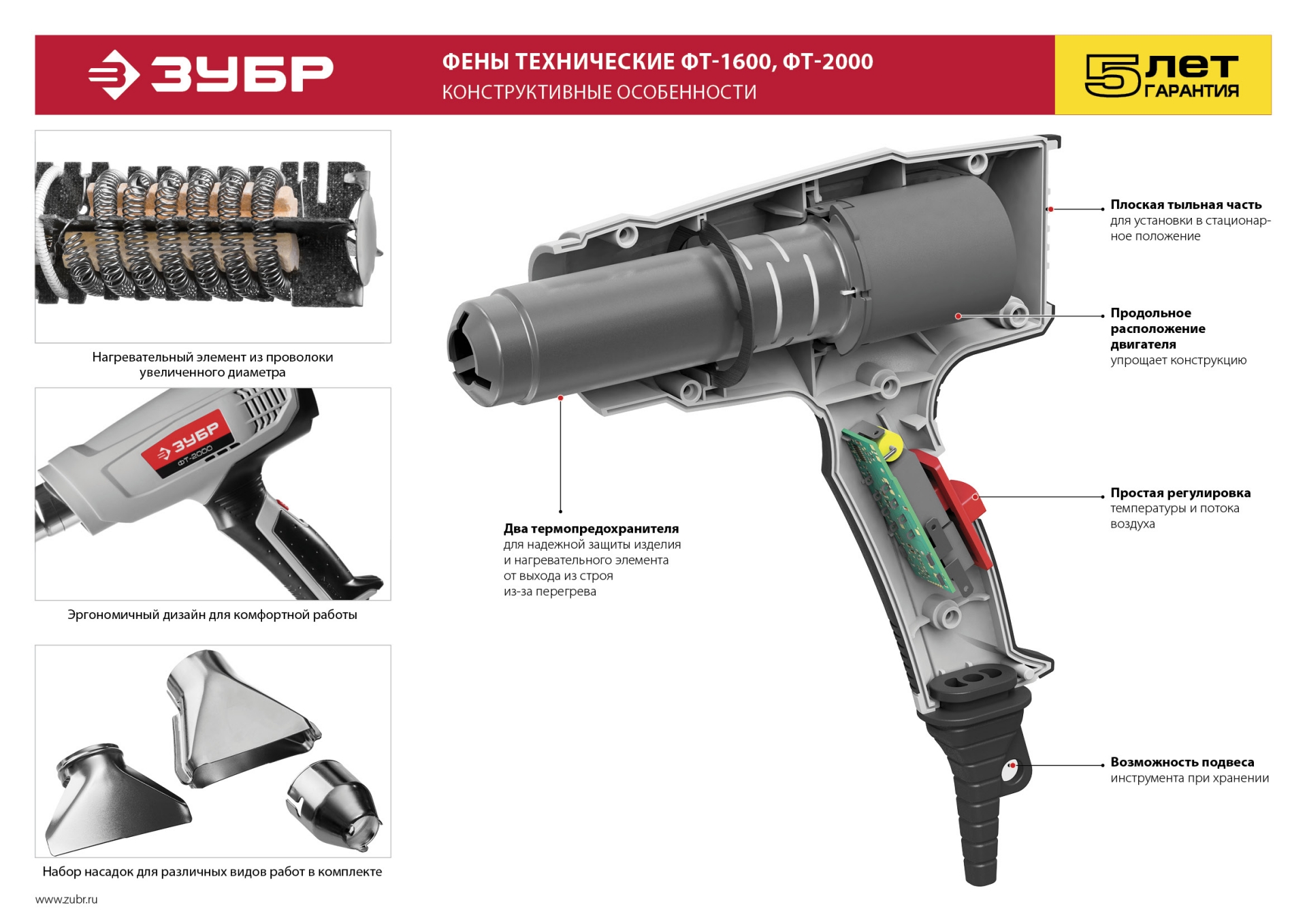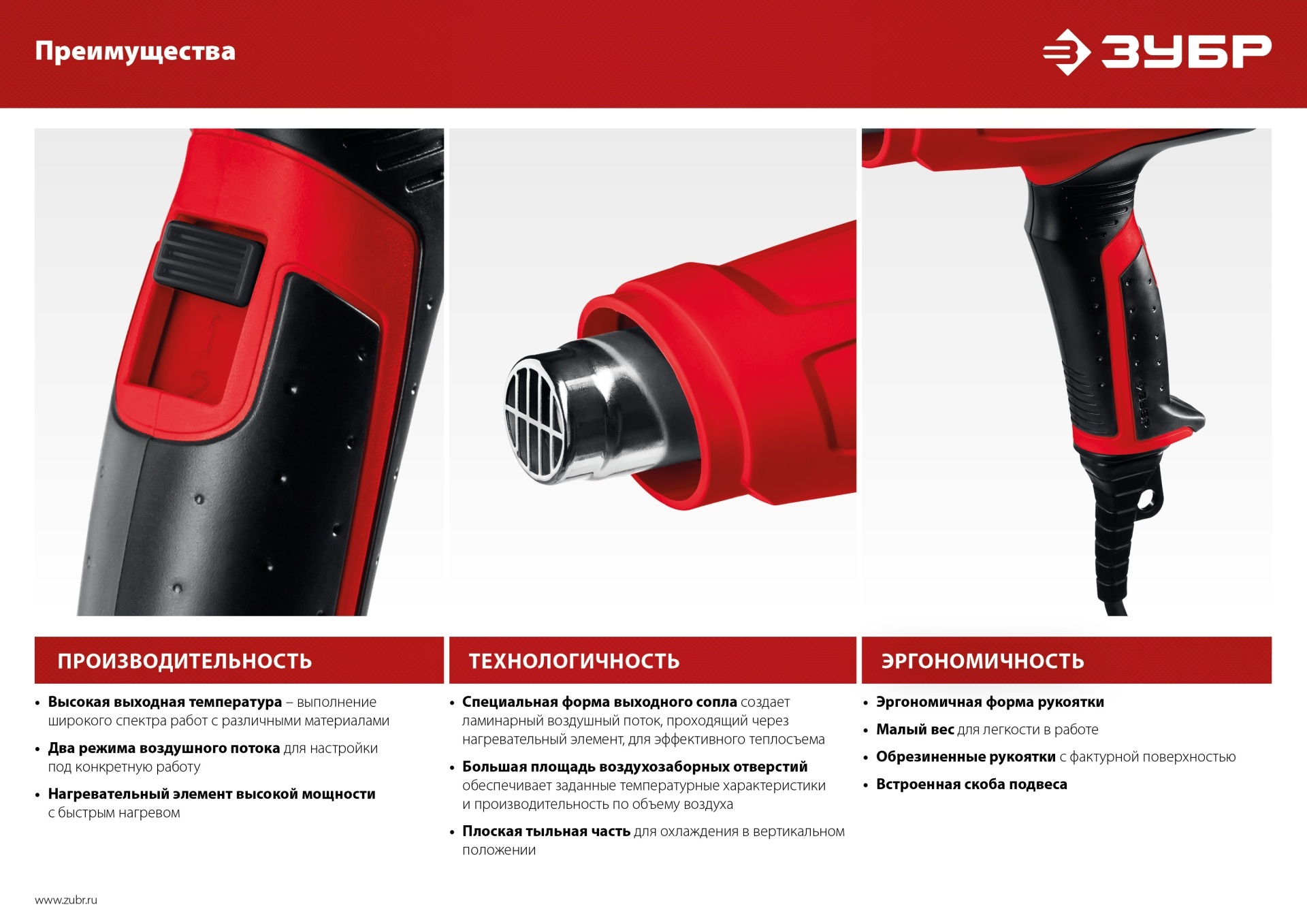 - 3 различные насадки в комплекте позволяют выполнять любую работу – от точечного нагрева до сушки больших площадей