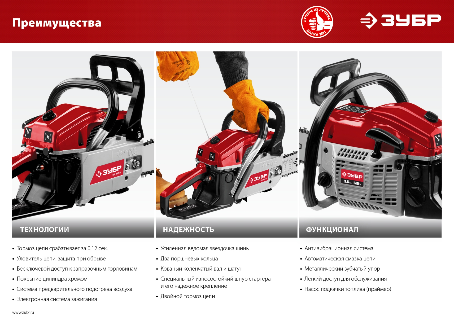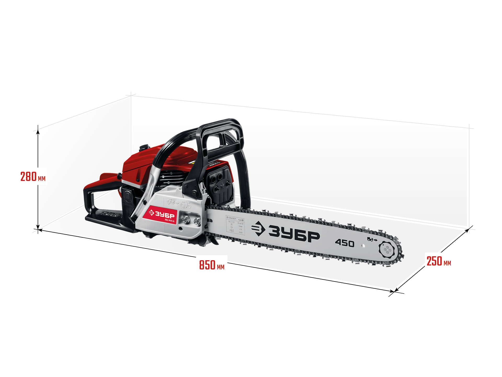 Идеальный вариант для пиления досок, бруса, стволов различных пород дерева на дачном участке. В отличие от электрической, бензиновая пила оснащена более мощным двигателем, безопасна в отношении поражения электрическим током, может работать в любую погоду и в любом месте. Функции легкого запуска, автоматической смазки цепи и эффективная антивибрационная защита делают пилу легкой в обращении и комфортной в работе. Двойной тормоз цепи, приводимый в действие при откидывании защитного щитка или при отпускании клавиши блокировки на рукоятке, а также встроенный цепеуловитель и металлический упор делают пилу безопасной в применении. Большая удельная мощность, высокое качество применяемых материалов и изготовления, обеспечивающие увеличенный ресурс, делают бензиновую пилу ЗУБР Вашим лучшим помощником. Обратите внимание, что рекомендуемая пильная гарнитура ЗУБР устанавливается только комплектом