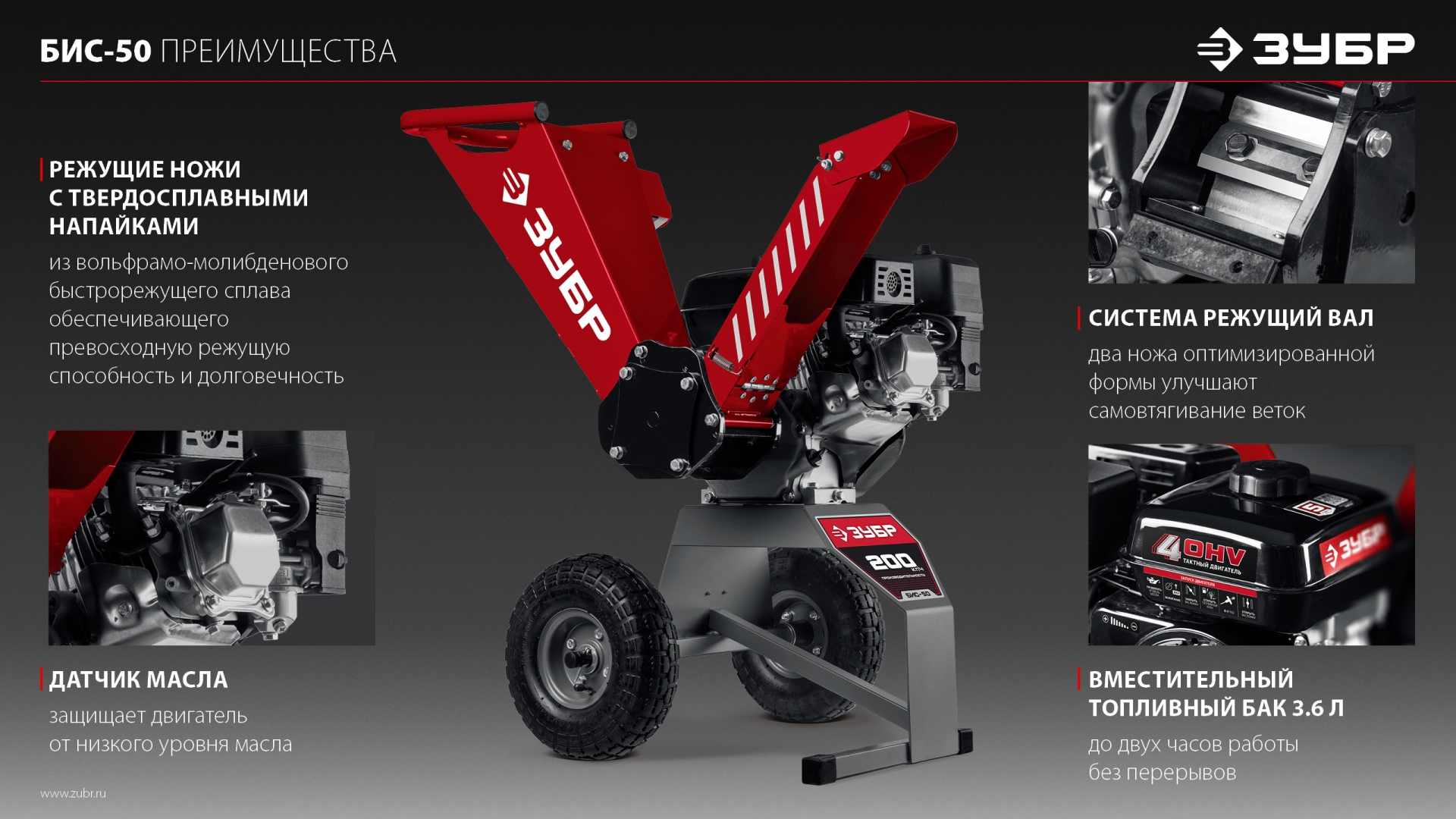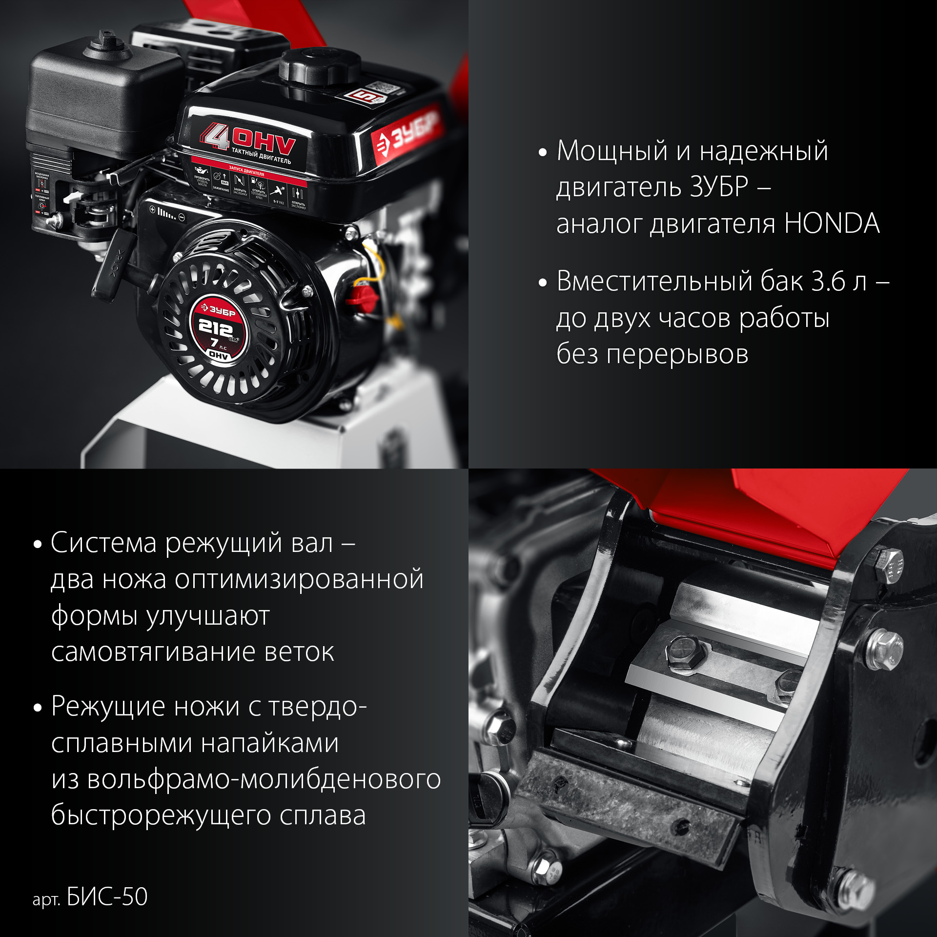 - Вместительный топливный бак объемом 3.6 л - до двух часов работы без перерывов