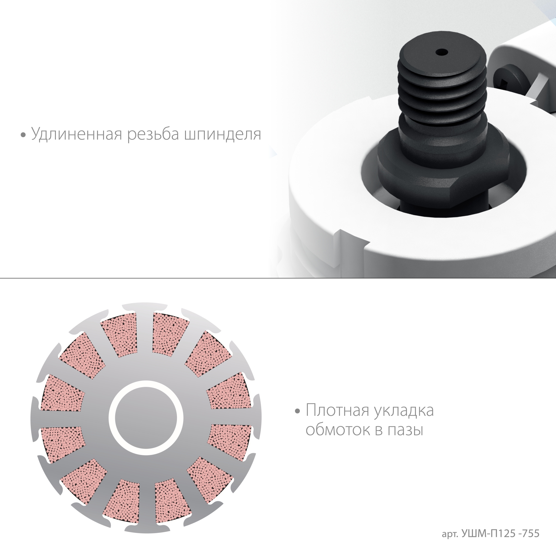 - HQM - повышенная стойкость двигателя к перегрузкам за счет более плотной укладки обмоток