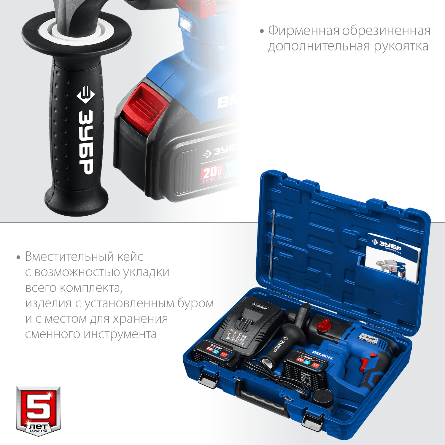 - Комфортная дополнительная рукоятка позволяет надежно удерживать инструмент при работе