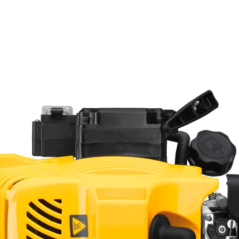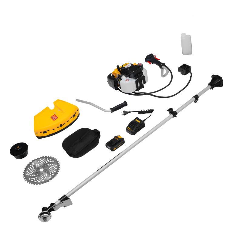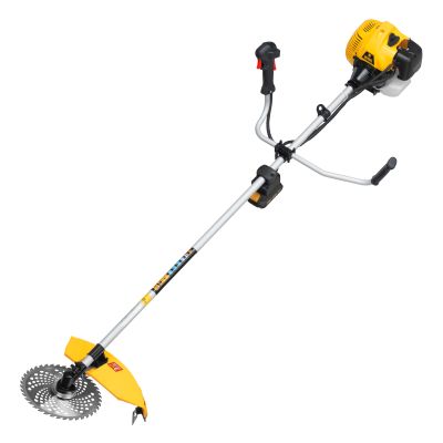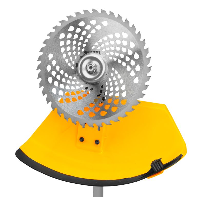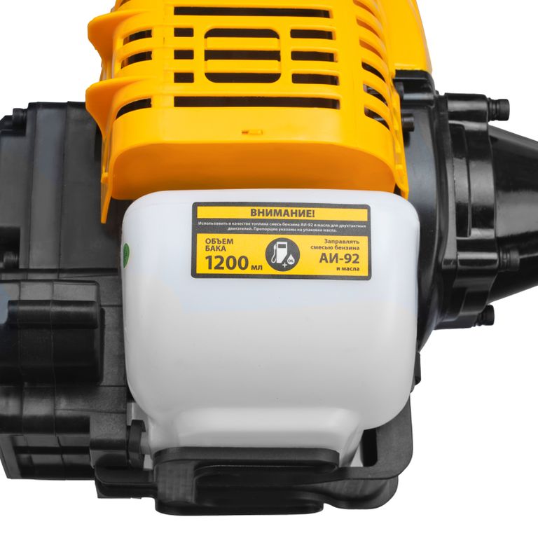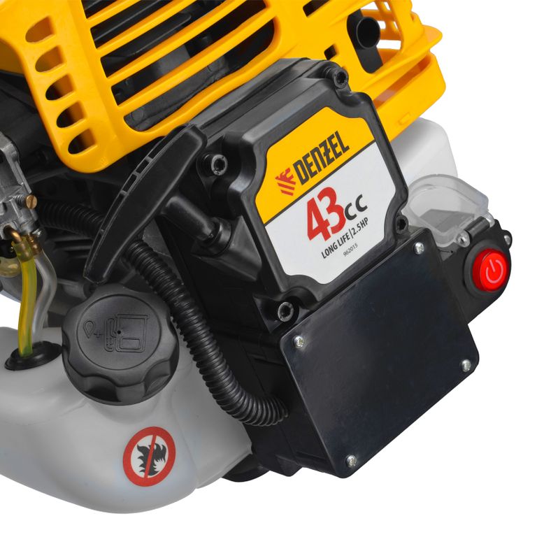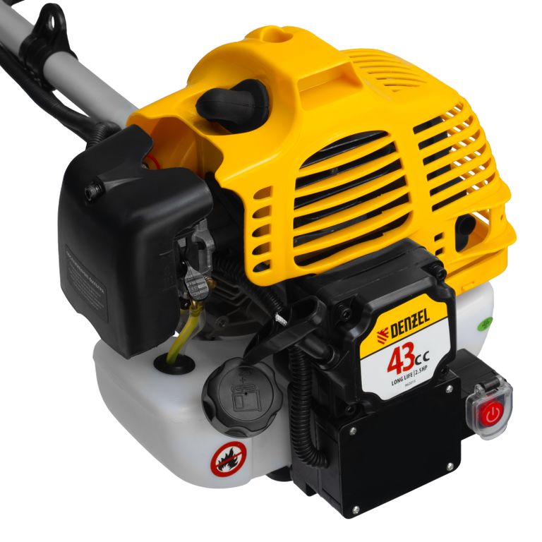 Бензиновый триммер Denzel DT-43E с двигателем объемом 43 куб. см, с неразъемной штангой и электростартером, поставляется комплектом из 2 частей и используется для ухода за дачным участком. С его помощью можно подравнять газон, скосить траву любого типа, в том числе с жесткими древовидными стеблями (полынь, крапива, лебеда, борщевик), а также срезать кустарник и молодые побеги деревьев с диаметром стволов до 10 мм. Триммер успешно справляется с этими задачами благодаря входящим в комплект катушке с леской и пильному диску с шириной скашивания 42 и 25,5 см соответственно. На штангу уже установлен редуктор и корпус сцепления, что упрощает подготовку инструмента к работе.