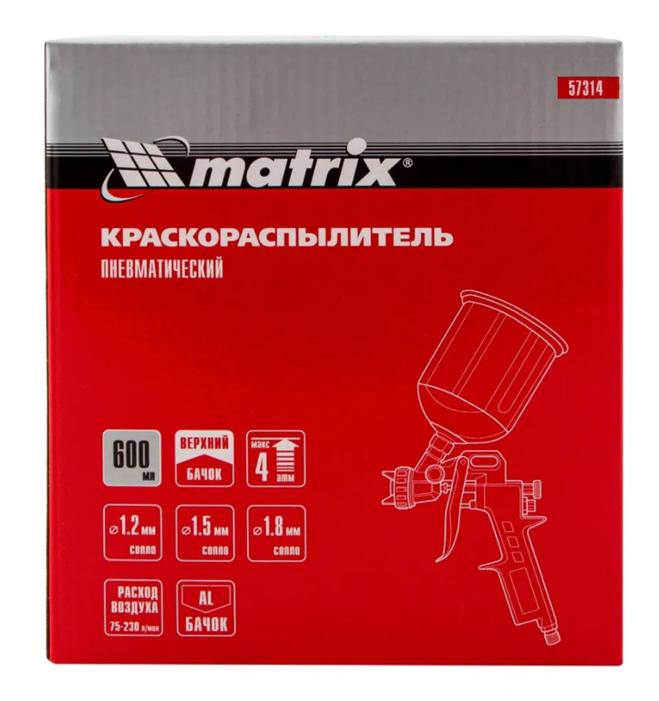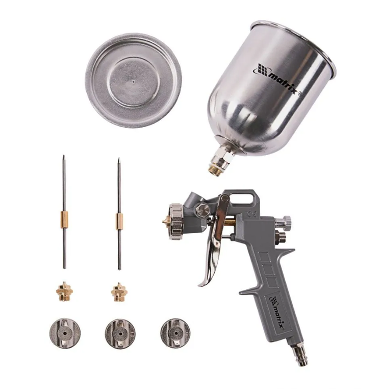 Краскораспылитель пневматический Matrix с верхним бачком V= 0,6 л, сопла диаметром 1.2, 1.5 и 1.8 мм