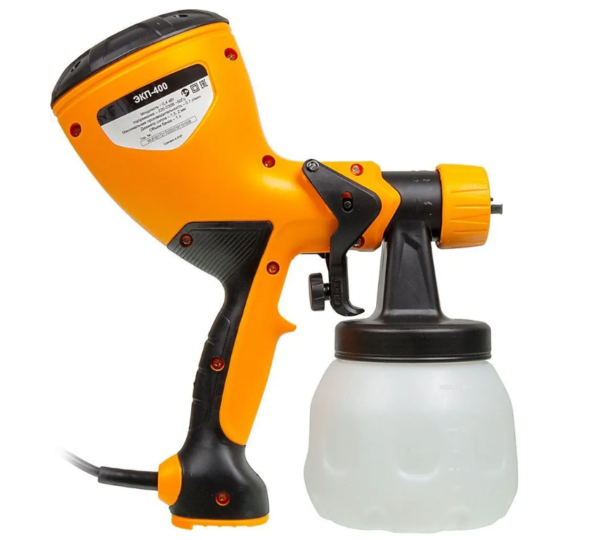 Краскораспылитель Вихрь ЭКП-400 простой в эксплуатации инструмент для нанесения краски и других составов (лака, грунтовки, пропиток). Вещество из устройства выделяется под давлением встроенного насоса. ЭКП-400 имеет форму пистолета с расположенным снизу бачком. Данная конструкция компактна и удобна для бытового использования, транспортировки и хранения.