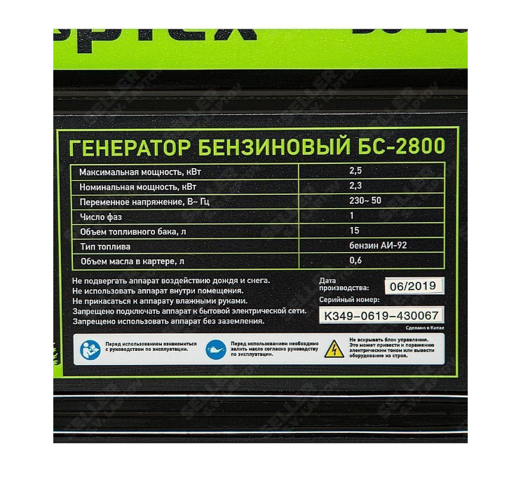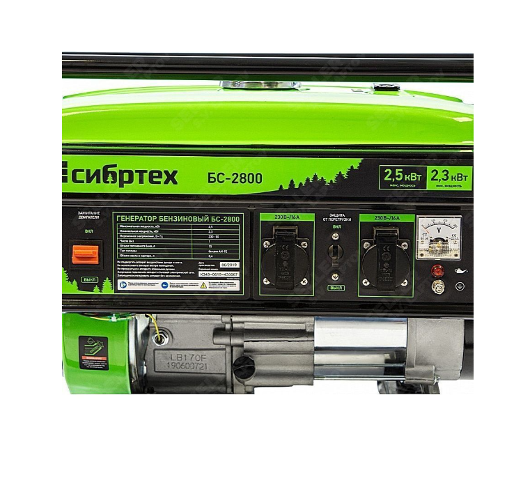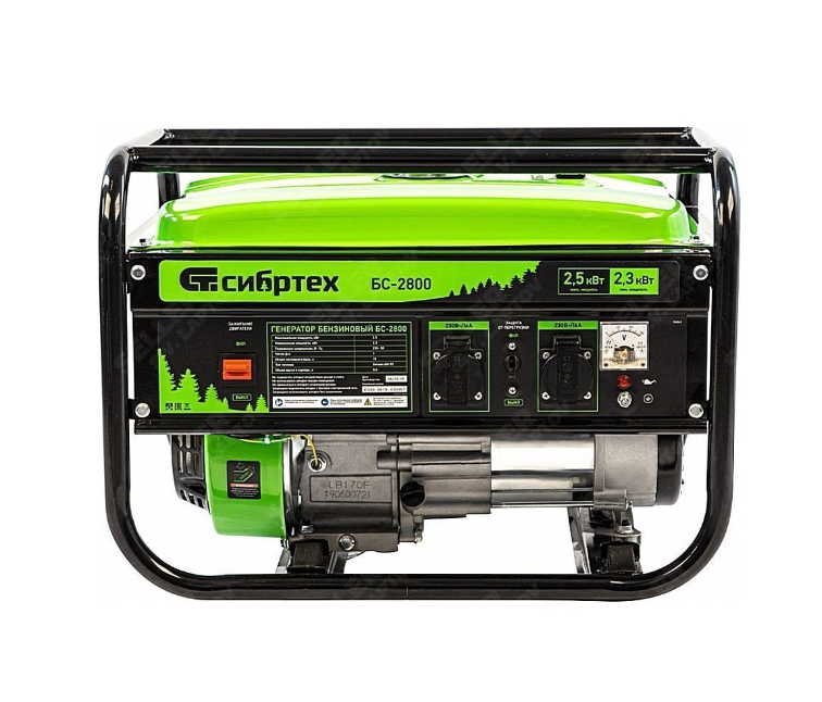 Бензиновый генератор СИБРТЕХ БС-2800 2.5 кВт, 230В, четырехтактный, 15 л, ручной стартер.