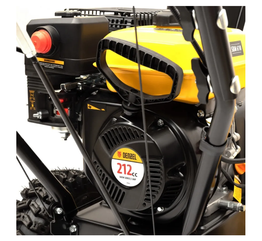 Снегоуборочная машина Denzel SBM 610 с двигателем объемом 212 cм3, ручным стартом и фарой предназначена для уборки территорий загородных домов, коттеджей, подъездных дорог и улиц СНТ, парковок и городских дворовых территорий.