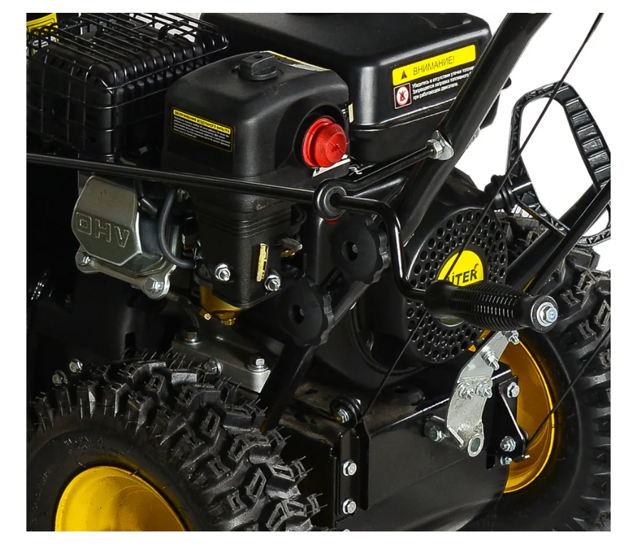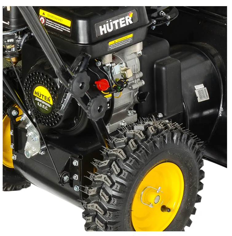Глубокий протектор на шинах позволяет не скользить при гололеде. Аппарат оборудован шнеком, который измельчает даже заледенелый и плотный мокрый снег.