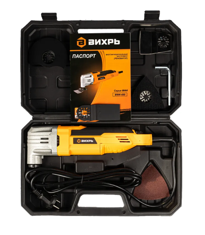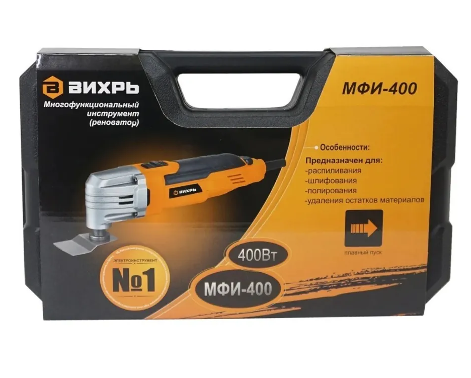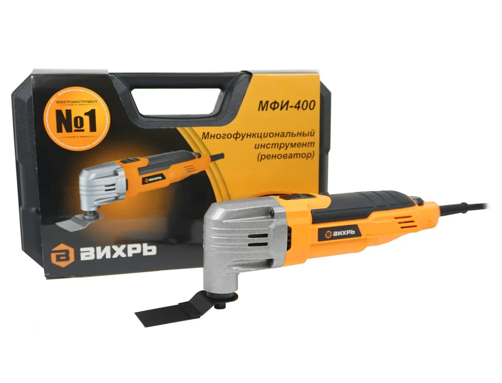 Многофункциональный инструмент (реноватор) МФИ-400 в кейсе Вихрь - это универсальный инструмент предназначен для выполнения различных работ: для распиливания и разрезания древесных материалов, пластмассы, гипса, цветных металлов, плитки; для сухого шлифования и полирования небольших поверхностей; для удаления остатков клея, штукатурки,бетона, лакокрасочного покрытия.