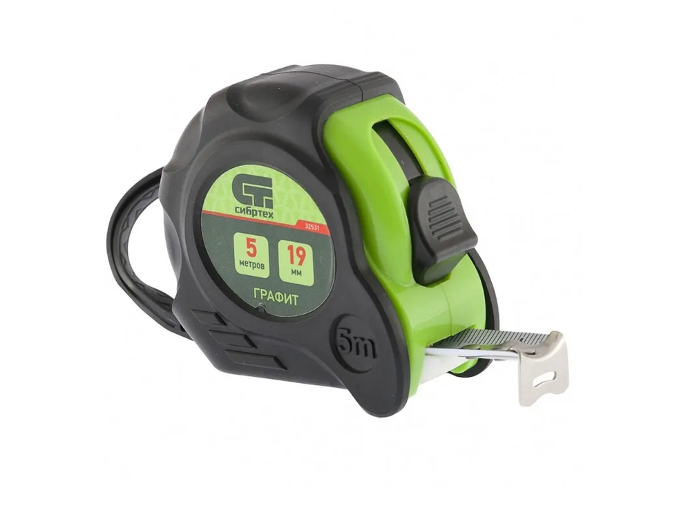 Рулетка Сибртех Графит 32531 с полотном размером 5 м х 19 мм, в обрезиненном корпусе с амортизатором, позволяет быстро измерить длину помещения, заготовок, конструкций и других объектов. Пригодится опытному или начинающему мастеру в ходе проведения измерительных работ в быту, на стройке, производстве. Компактный и удобный инструмент легко поместится в сумку, что делает его оптимальным для выездных работ.