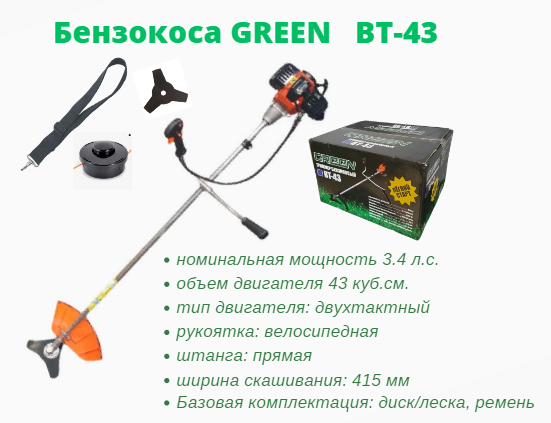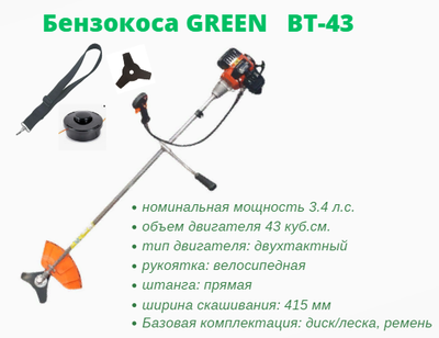 Бензокоса GREEN ВТ-43 2,5 кВт 3,4 л.с."3-х лопастной нож, катушка с леской, наплечный ремень