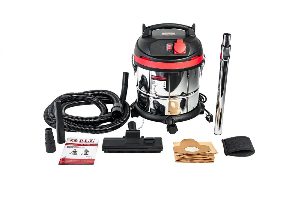 Пылесос промышленный P.I.T. PVC20-C МАСТЕР (1,5кВт,3 м шланг,пыль.сбор 20л,нерж.к-с,бум.мешок, 2кВт подключаемый инстр) используется для сбора сухого мусора и жидкости с поверхности.