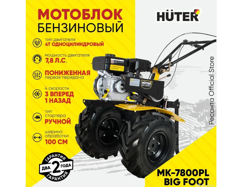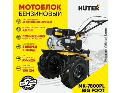 Мотоблок HUTER МК-7800PL BIG FOOT используется для обработки почвы методом культивации, то есть её рыхления без переворота почвы, выравнивания, других операций. Культиватор дает хорошие результаты на приусадебных и фермерских хозяйствах и дачных участках, на ограниченных территориях, междурядьях, на клумбах и возле деревьев. Мотокультиватор укомплектован четырёхтактным двигателем внутреннего сгорания.