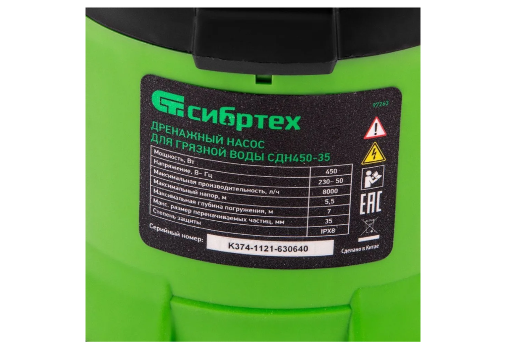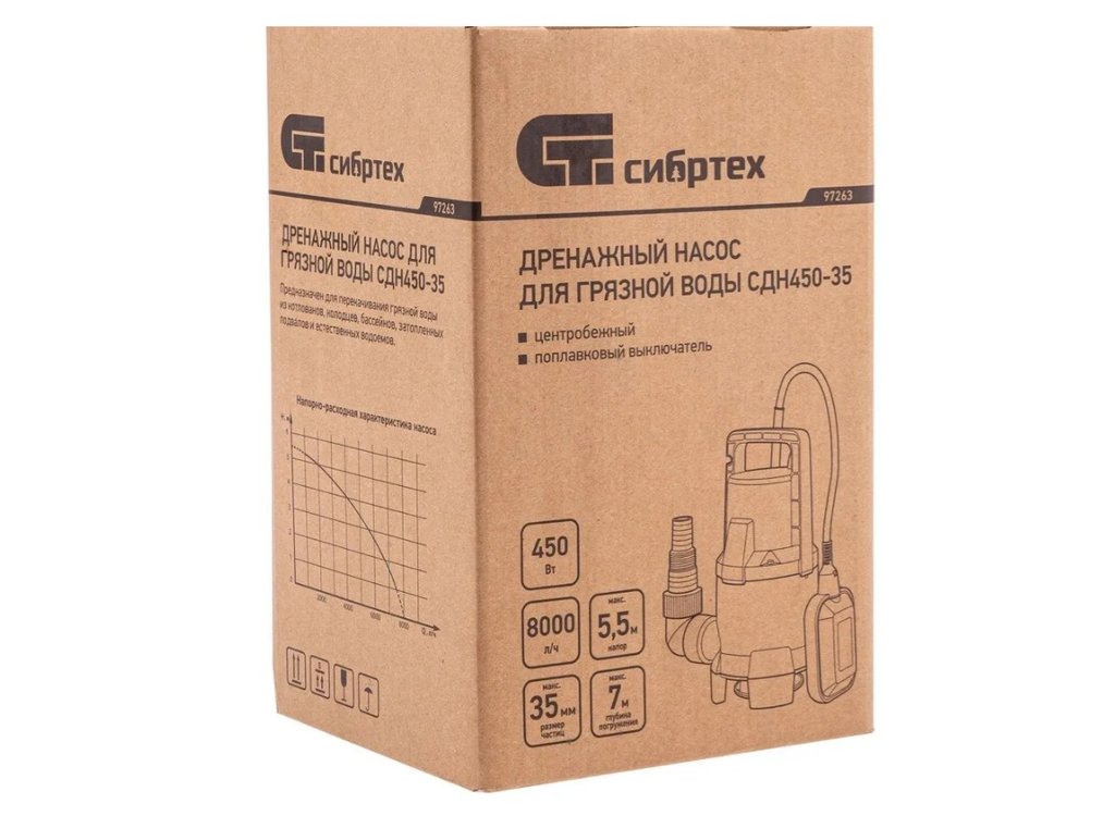 Насос дренажный для грязной воды Сибртех СДН450-35, 450 Вт, напор 5.5 м, 8000 л/ч