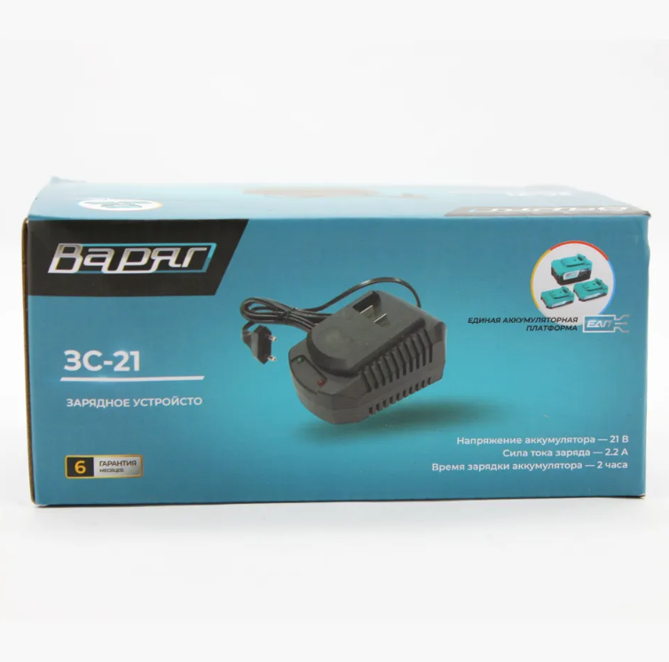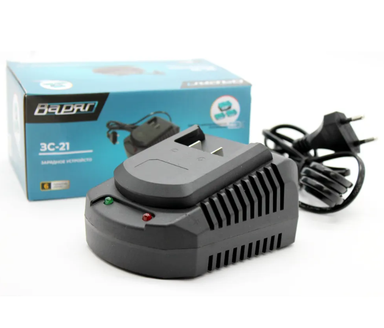 Зарядное устройство ВАРЯГ ЗС-21 предназначено для зарядки литиево-ионных (Li-Ion) аккумуляторов с напряжением 21 В. На корпусе имеется индикатор заряда, которой информирует о статусе работы устройства. Напряжение аккумулятора - 21 В; Сила тока заряда - 2.2 А; Время зарядки аккумулятора - 2 часа.