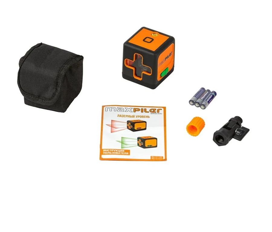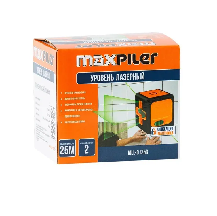Уровень лазерный MAXPILER MLL-0125G (рабочий диапазон 25м, зеленый лазер, 2 луча, фикс., резьба под штатив,3х1.5В (ААА))